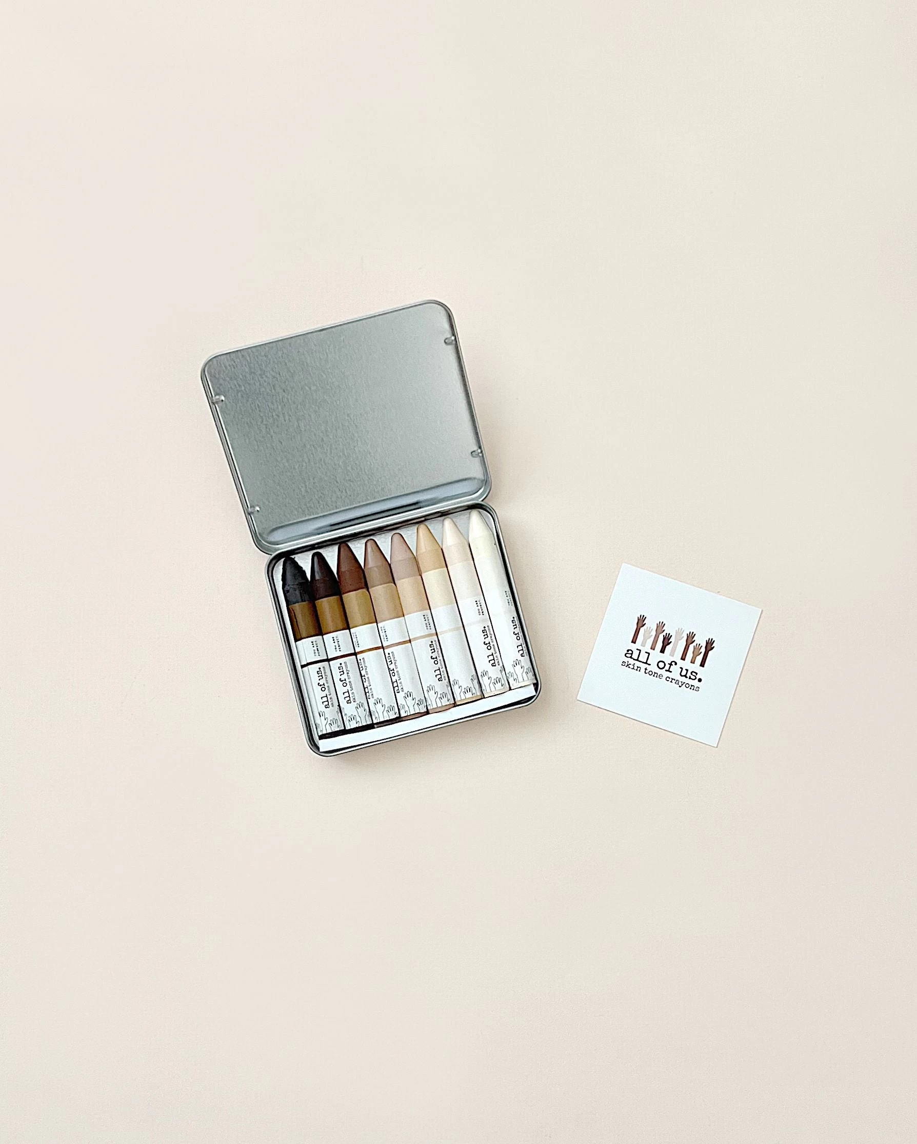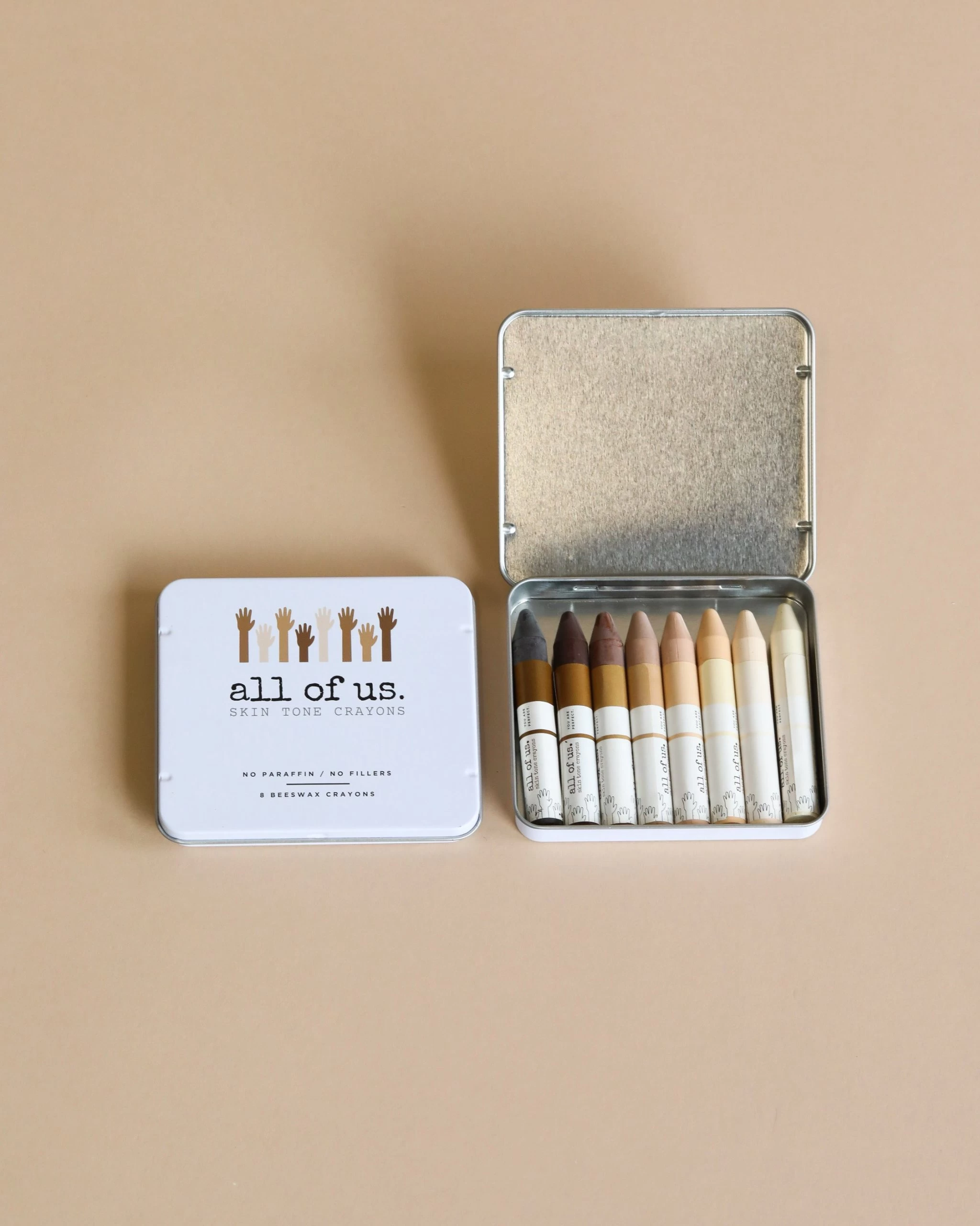 This set of 8 skin tone crayons is richly pigmented to represent and celebrate the beauty of all skin tones. Each crayon is poured by hand to create a thick, round crayon that is easy for little hands to grasp. The round tip is incredibly versatile and well-suited to drawing face shapes, large portraits, and broad strokes. These non-toxic crayons are lovingly handcrafted and contain No paraffin. No soy wax. No chemical fillers. Only sustainably sourced beeswax, plant waxes, and natural earth pigments.
