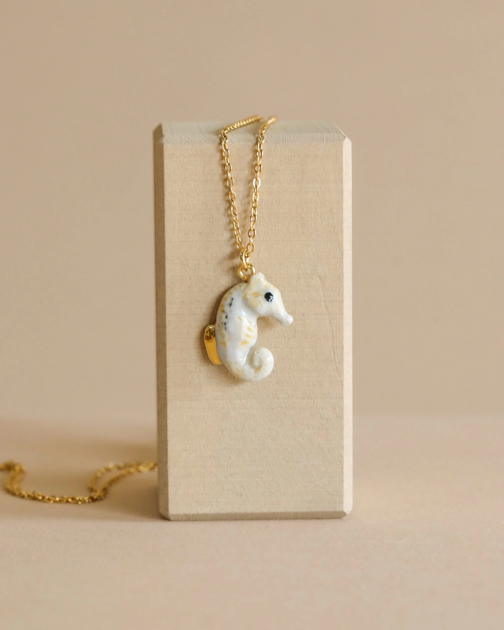 Discover the allure of the Arctic with our limited-edition Arctic Seahorse Necklace! This handcrafted porcelain pendant features a seahorse hand-painted in icy whites and blues with stunning gold details. Strung on a golden chain, this necklace is a versatile and captivating addition to any ensemble. Due to the handmade nature of this product, slight variations in color and design may occur, making each piece truly one-of-a-kind. Perfect for ocean enthusiasts, collectors, or anyone who appreciates the blend of fashion, artistry, and marine mystique.