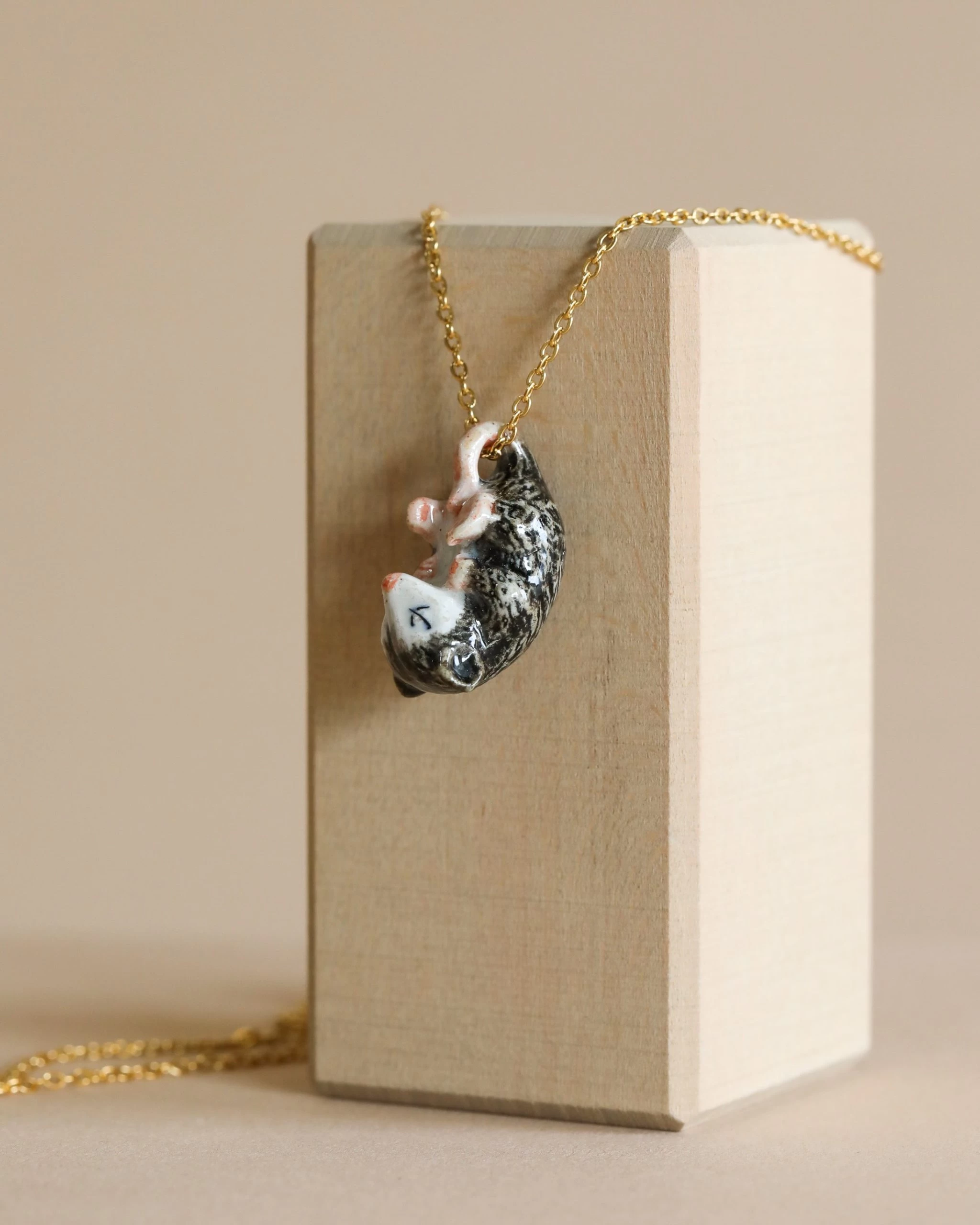 Adorn yourself with a timeless favorite—our Snoozing Baby Possum Necklace! This handcrafted porcelain pendant is one of our oldest and best-selling designs, meticulously hand-painted to create a sculptural masterpiece. Strung on a delicate chain, this necklace is a versatile and endearing addition to any collection. Due to the handmade nature of this product, slight variations in color and design may occur, making each piece truly one-of-a-kind. Perfect for animal lovers, collectors, or anyone who appreciates the blend of fashion, artistry, and a touch of woodland charm.