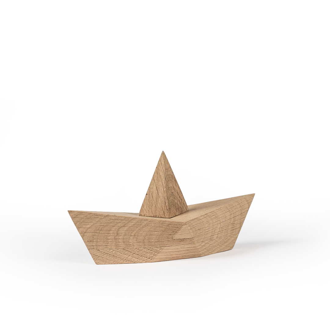 With Admiral we are heading for an aesthetic rendering of the childhood paper boat, here created in solid oak and with a hidden magnet that holds the sail in place.