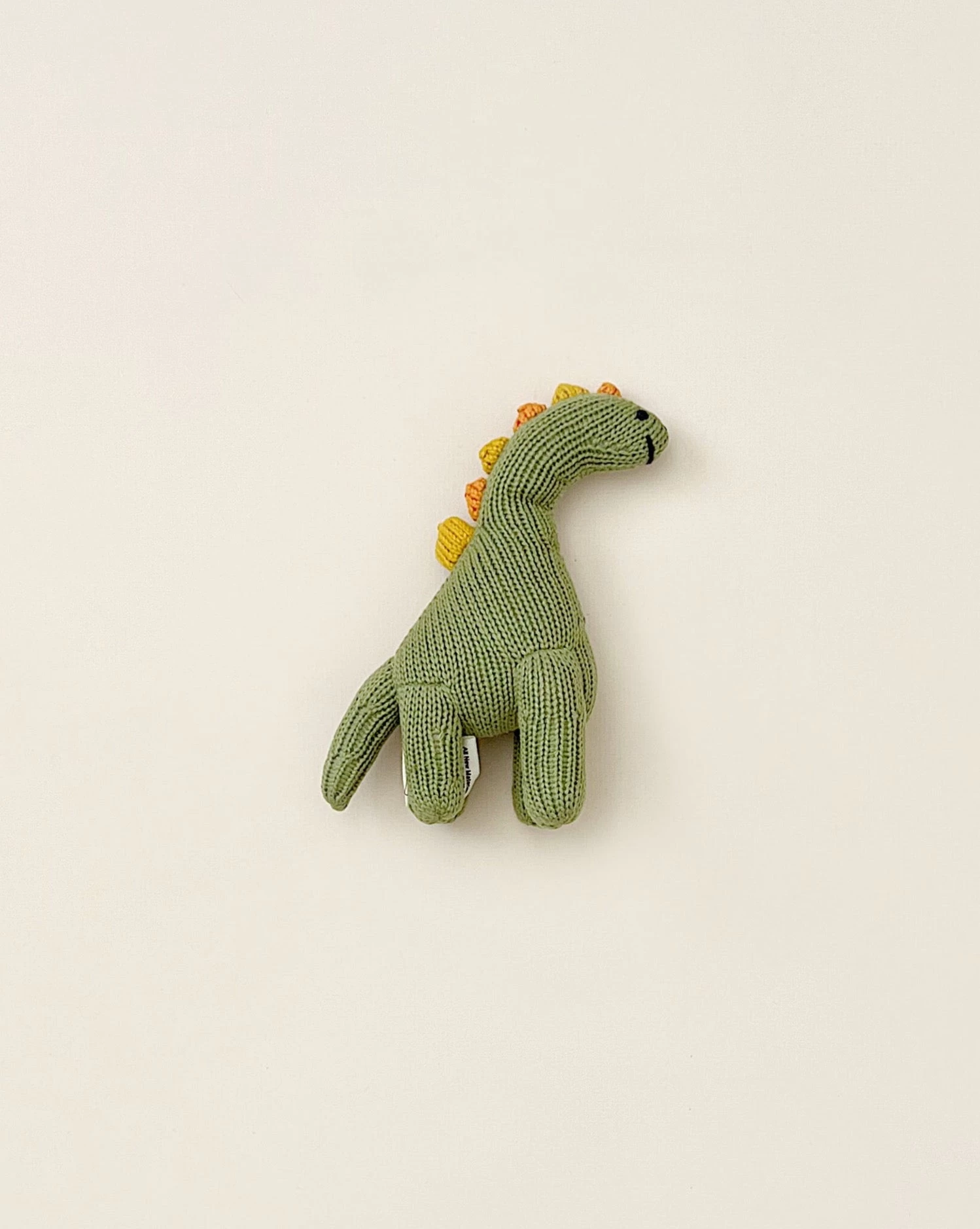 Our new brachiosauras rattle is getting rave reviews for good looks and lovability. Handknit in Peru from softest organic cotton, this big guy stands 7.5″ tall and is ready to stand guard in nurseries around the globe. For dinosaurs lovers big and small. -Gentle wash on cold and air dry -Organic cotton with poly stuffing -Perfect for grasping, imaginative play and nursery decor.