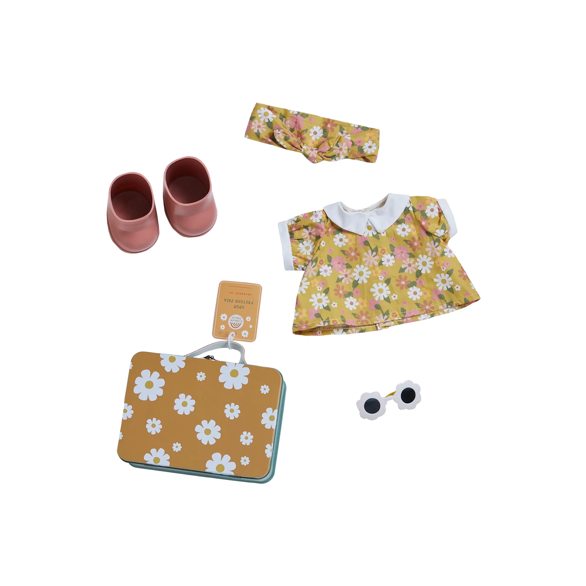 This doll comes with a removable unisex outfit, socks, nappy, and shoes. The additional metal suitcase includes a floral dress, matching headband, pink boots and fitted sunglasses.