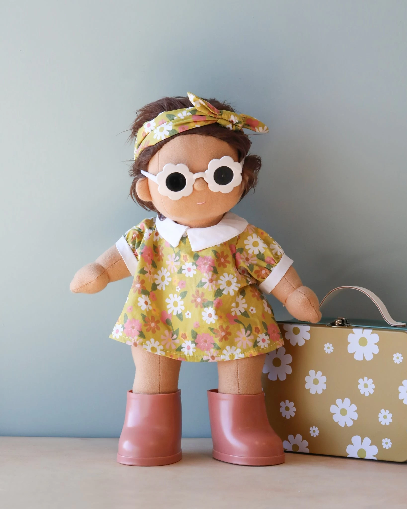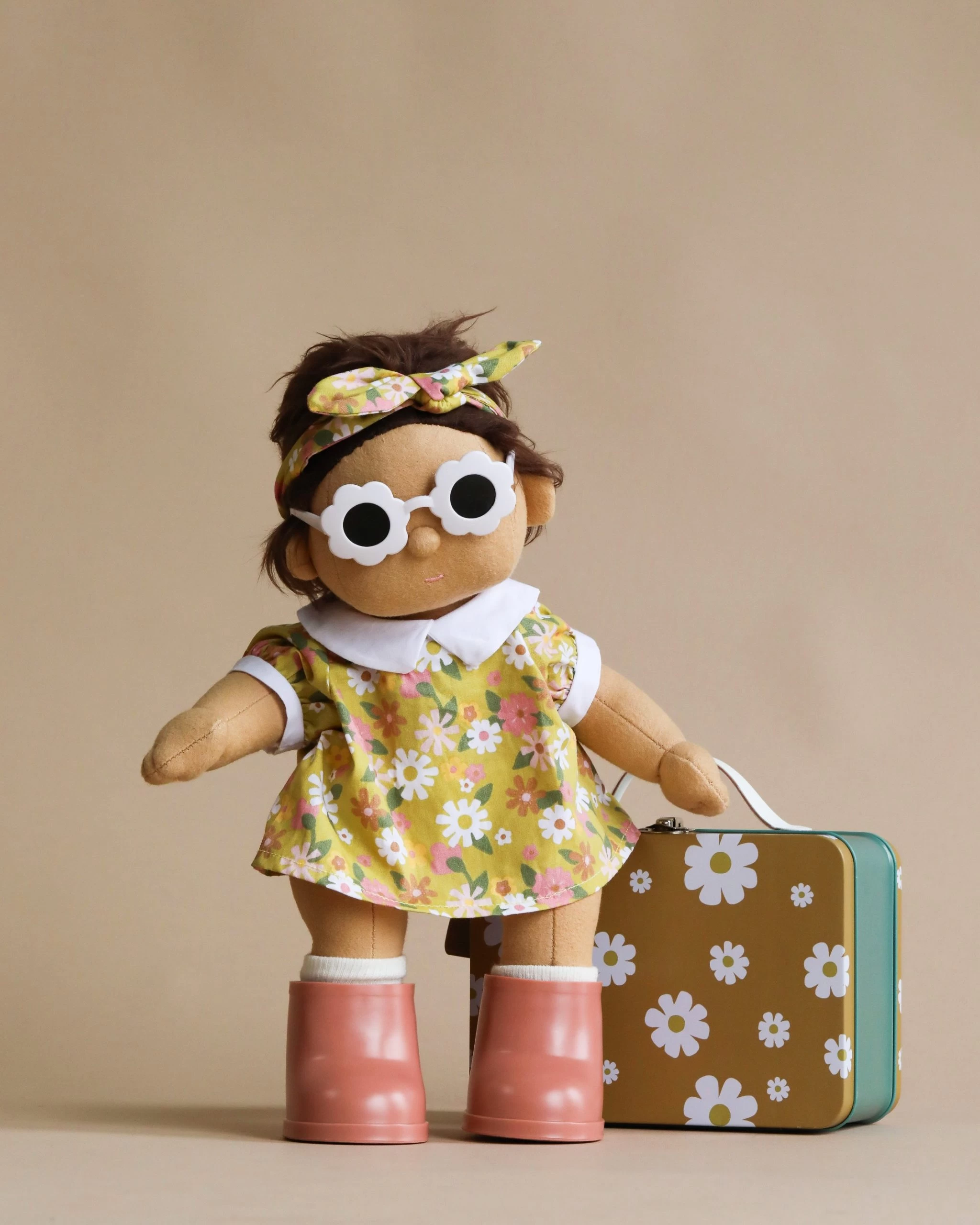 This doll comes with a removable unisex outfit, socks, nappy, and shoes. The additional metal suitcase includes a floral dress, matching headband, pink boots and fitted sunglasses.
