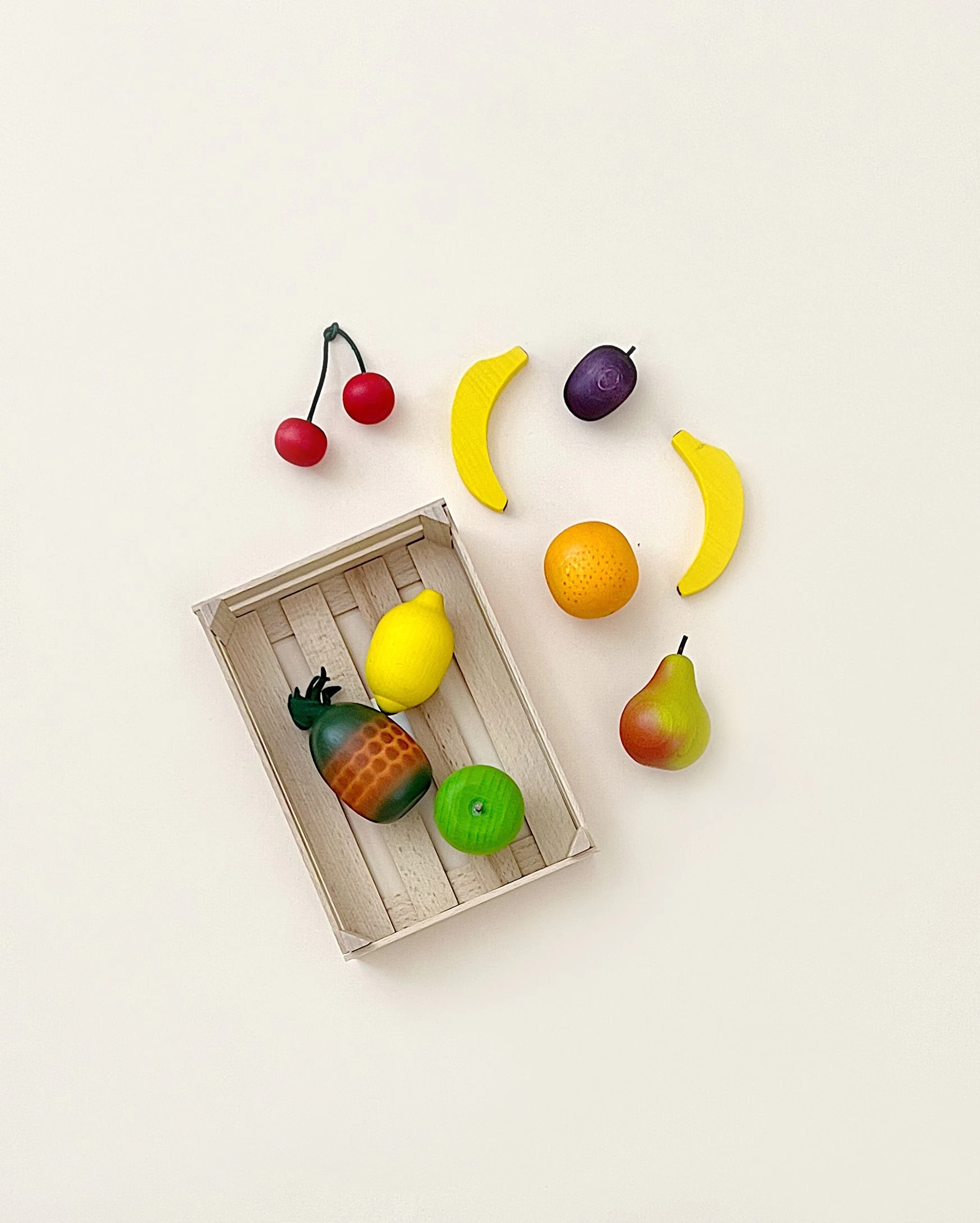 The crate contains a mixed assortment of fruits shaped from colourfully lacquered wood: 1 orange (1.6″), 2 small bananas (3″), 1 lemon (2.5″), 1 green apple (1.75″), 1 red/green pear (2.4″), a couple of cherries, 1 plum (1.5″) and 1 pineapple. (3″)