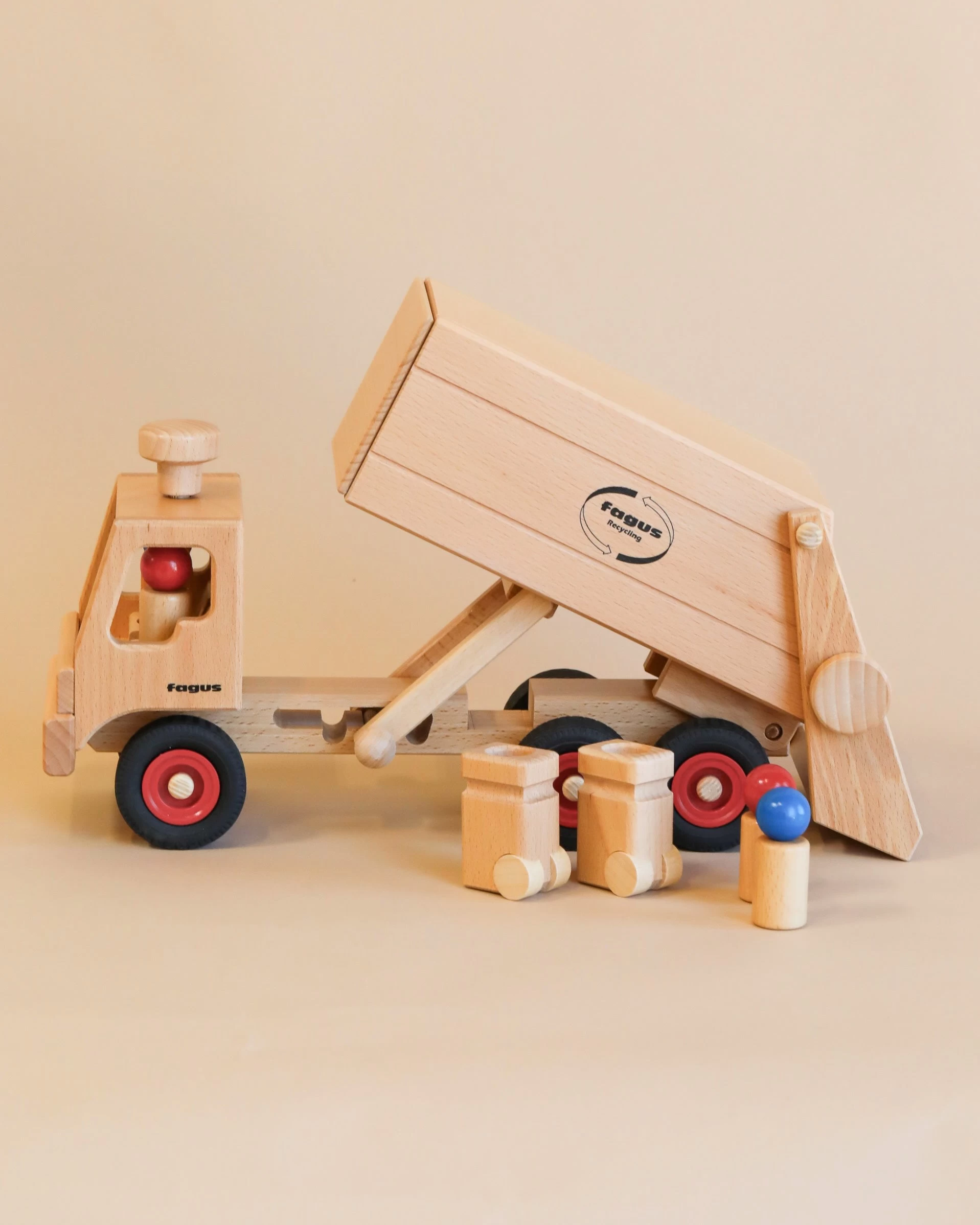 Kids can have fun with this Fagus Wooden Garbage Truck, featuring two removable bins that can be filled and tipped into the truck’s cargo space. Inside is a pair of peg figures, which can be removed for imaginative play. The sturdy structure and real rubber tires make it resistant to wear and tear from driving and construction activities. The wooden toys are handcrafted in a workshop for the disabled using beechwood, with interlocking, doweled, and glued connections. No nails, screws, or staples are used.