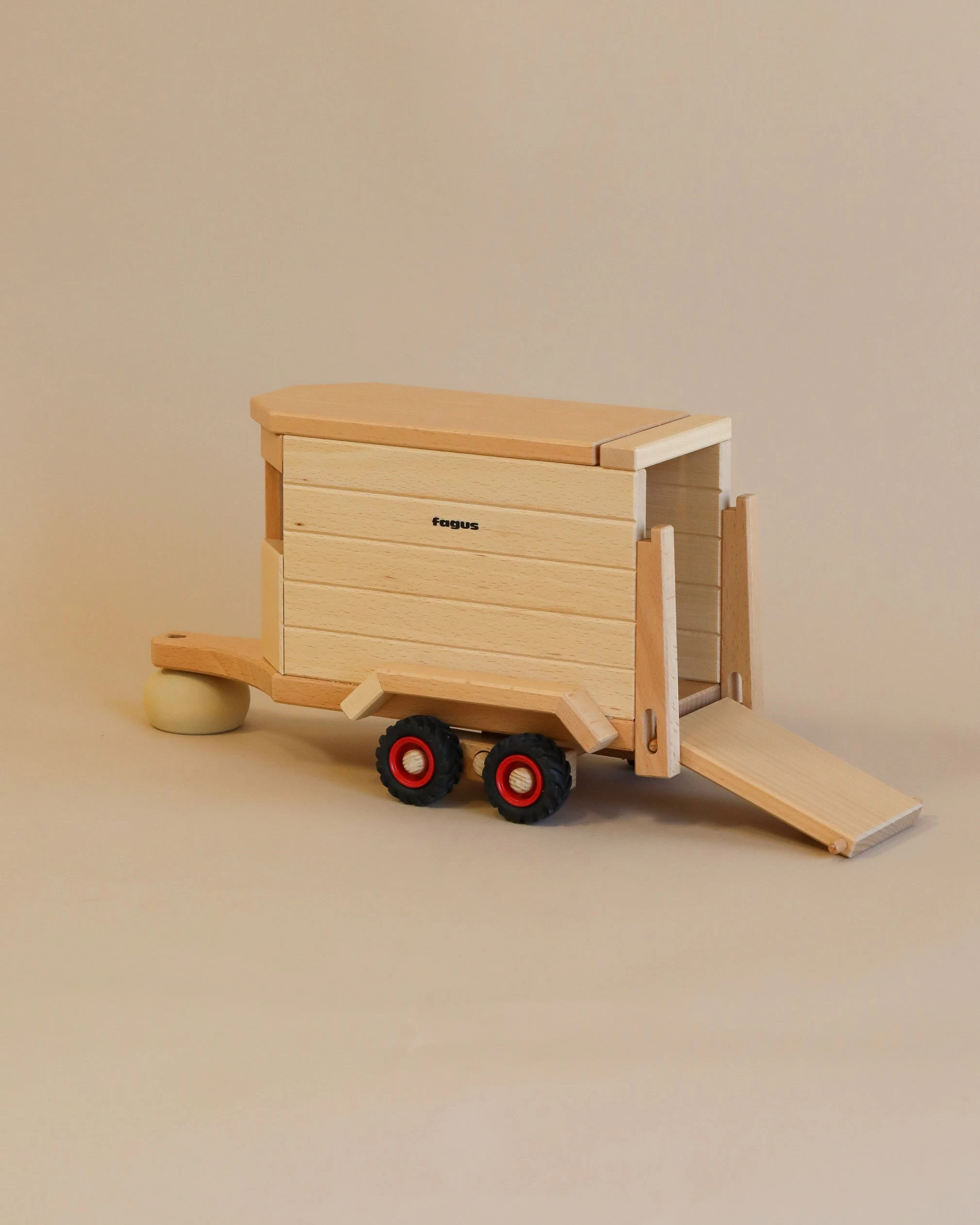 A horse box with hinged tailgate and removable roof. Easily attach this Horse Box to tractors, trucks, or other Fagus vehicles with a hitch. The sturdy structure and real rubber tires make it resistant to wear and tear from driving and construction activities. The wooden toys are handcrafted in a workshop for the disabled using beechwood, with interlocking, doweled, and glued connections. No nails, screws, or staples are used.