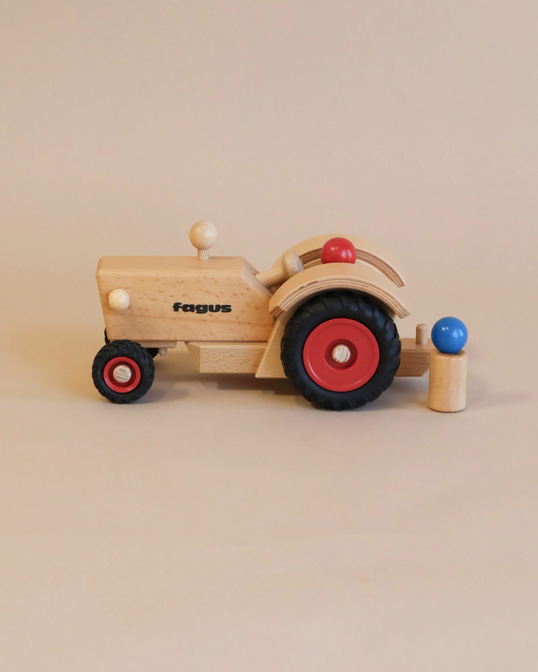 This classic, steerable wooden tractor by Fagus comes with two removable peg figures, which can be removed for imaginative play. The sturdy structure and real rubber tires make it resistant to wear and tear from driving and construction activities. The wooden toys are handcrafted in a workshop for the disabled using beechwood, with interlocking, doweled, and glued connections. No nails, screws, or staples are used. Complement the set with a farm cart or wagon to manage a variety of tasks around the farm.
