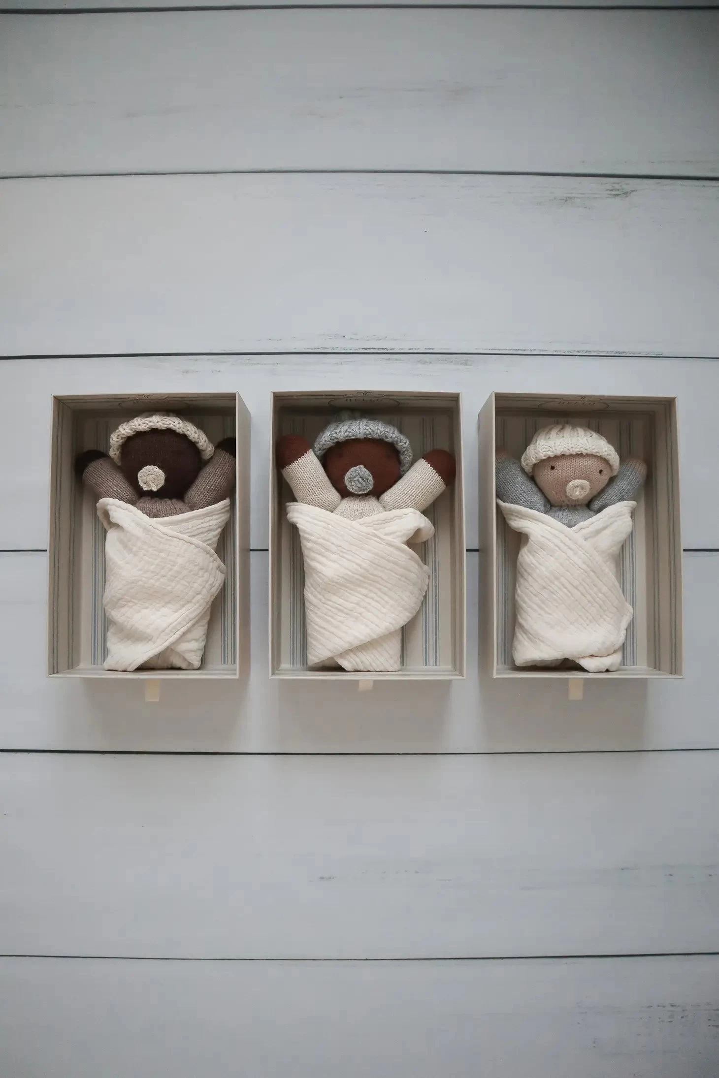 Each doll comes with a complimentary, 100% organic cotton gauze swaddle. Your newborn keepsake will arrive all bundled up inside our beautiful keepsake box. Perfect for gifting! Due to our dolls’ handmade nature, no two dolls look alike, or are completely symmetrical! It is the asymmetry that gives each doll character and makes it unique. If your doll arrives a little flat, it just needs a little fluffing after it’s voyage in the shipping box.