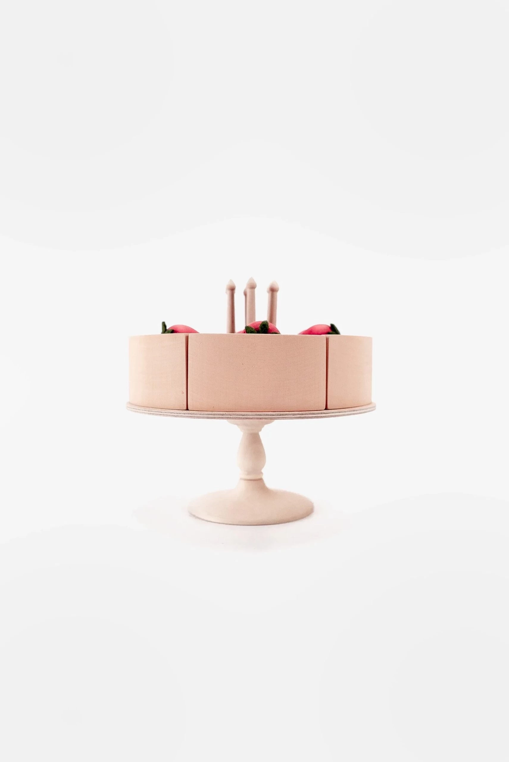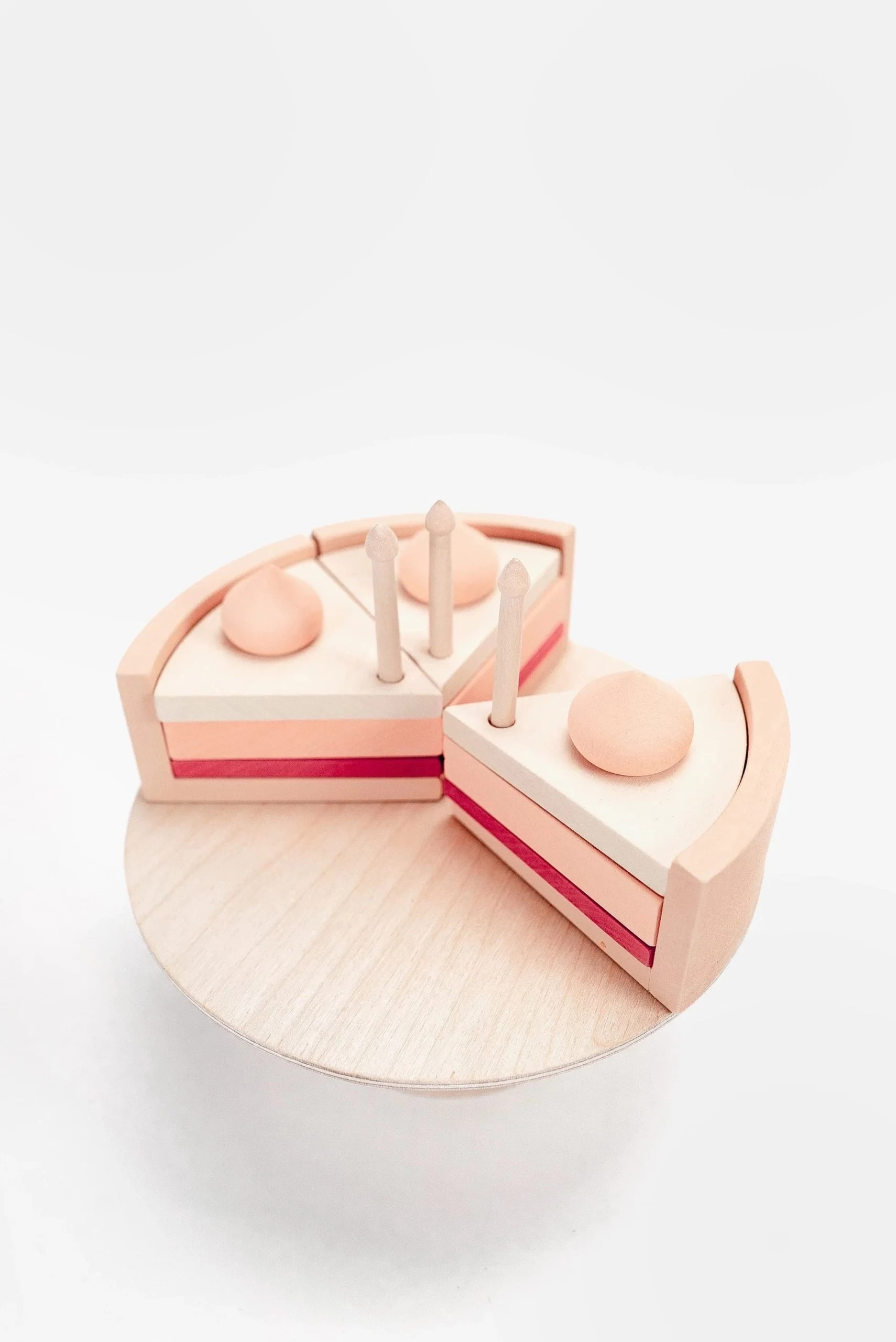 The set includes a stand, 6 pieces of cake, 6 candles, 6 strawberries halves. Each piece consists of a base and a side + three separate layers. They can be changed among themselves, so that the child can choose the order of the layers. This way, the child can make 3 different cakes.