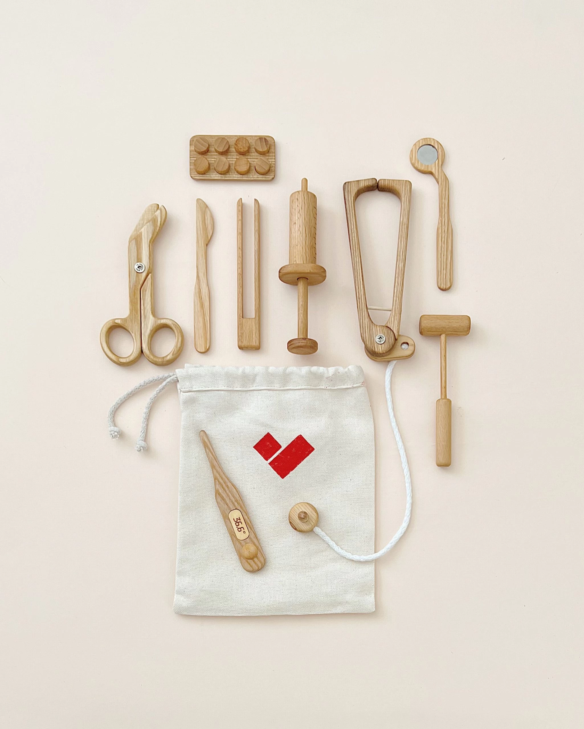 Handmade in Russia, this 10 piece medical kit is the perfect imaginative play toy for future doctors and nurses.