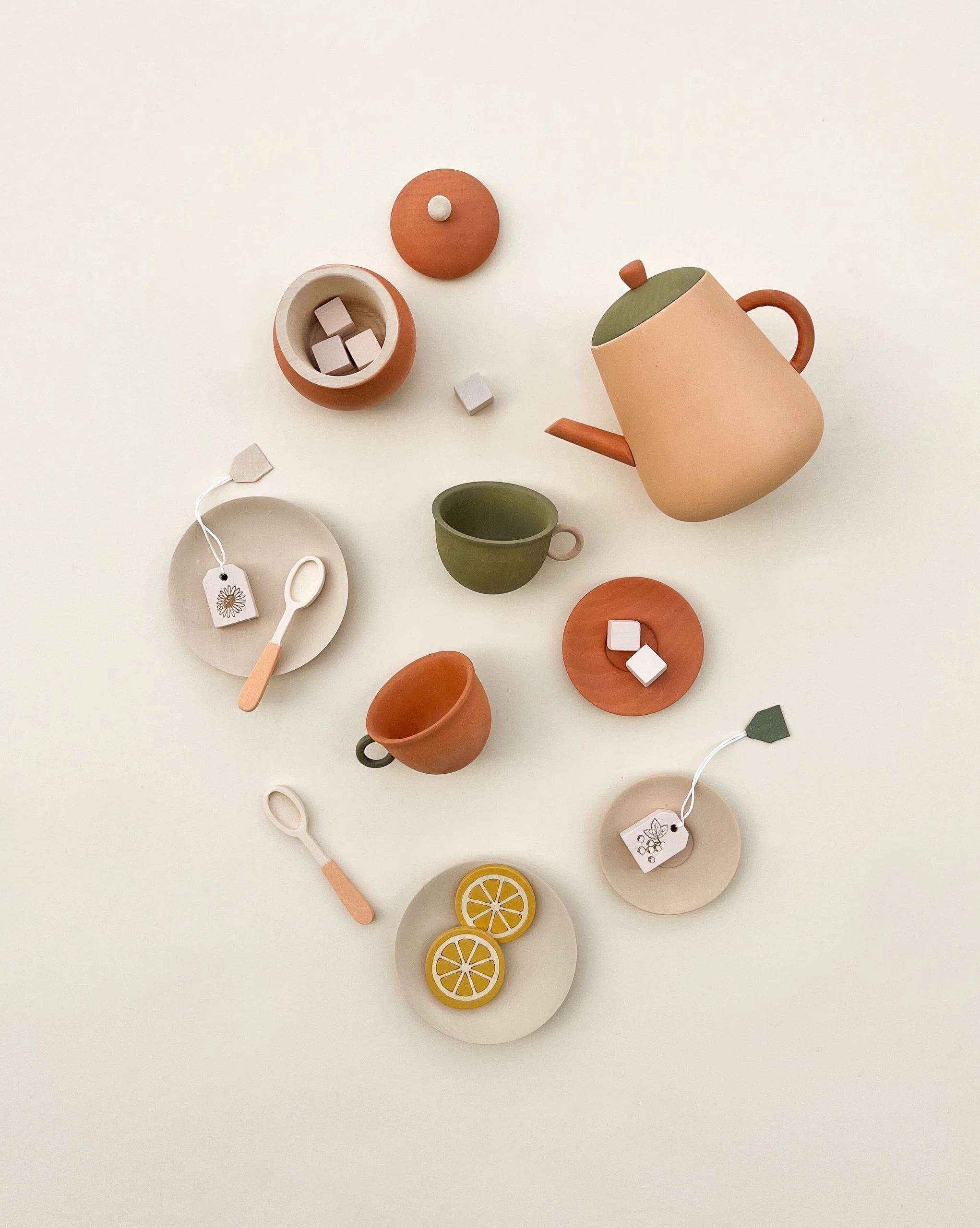 The set includes: – a teapot – two cups and saucers – sugar bowl and 6 sugar cubes – two dessert plates – two teaspoons – two tea bags – two pieces of lemon