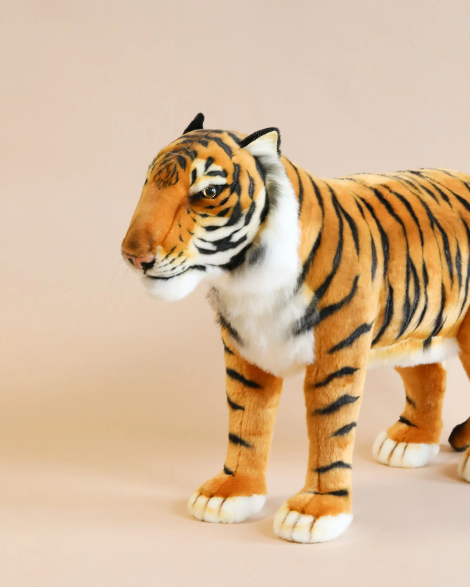 Artisan hand sew the animals “inside out”, an old world tradition that results in the mininization of seams, and their bodies are carefully “sculpted” to create “musculature” and “features” like movement in a walking or sitting position that are unique to each creature. On average, there are 42 separate pieces required to make each animal, that must be combined by a team of truly creative artists to create the distinctly realistic features that characterize HANSA animals. (Some animals have as many as 240 different parts!) Each animal is individually hand sewn, to give it a unique “personality”, there are more than 860 different fabrics and man-made furs from which the “coat” and “hides” are made, along with over 6000 sets of different eyes, whiskers, claws, noses, and related accessories allocated for creating these wonderful plush animals. Stuffing emphasizes careful attention to the placement of the highest quality man-made materials.
