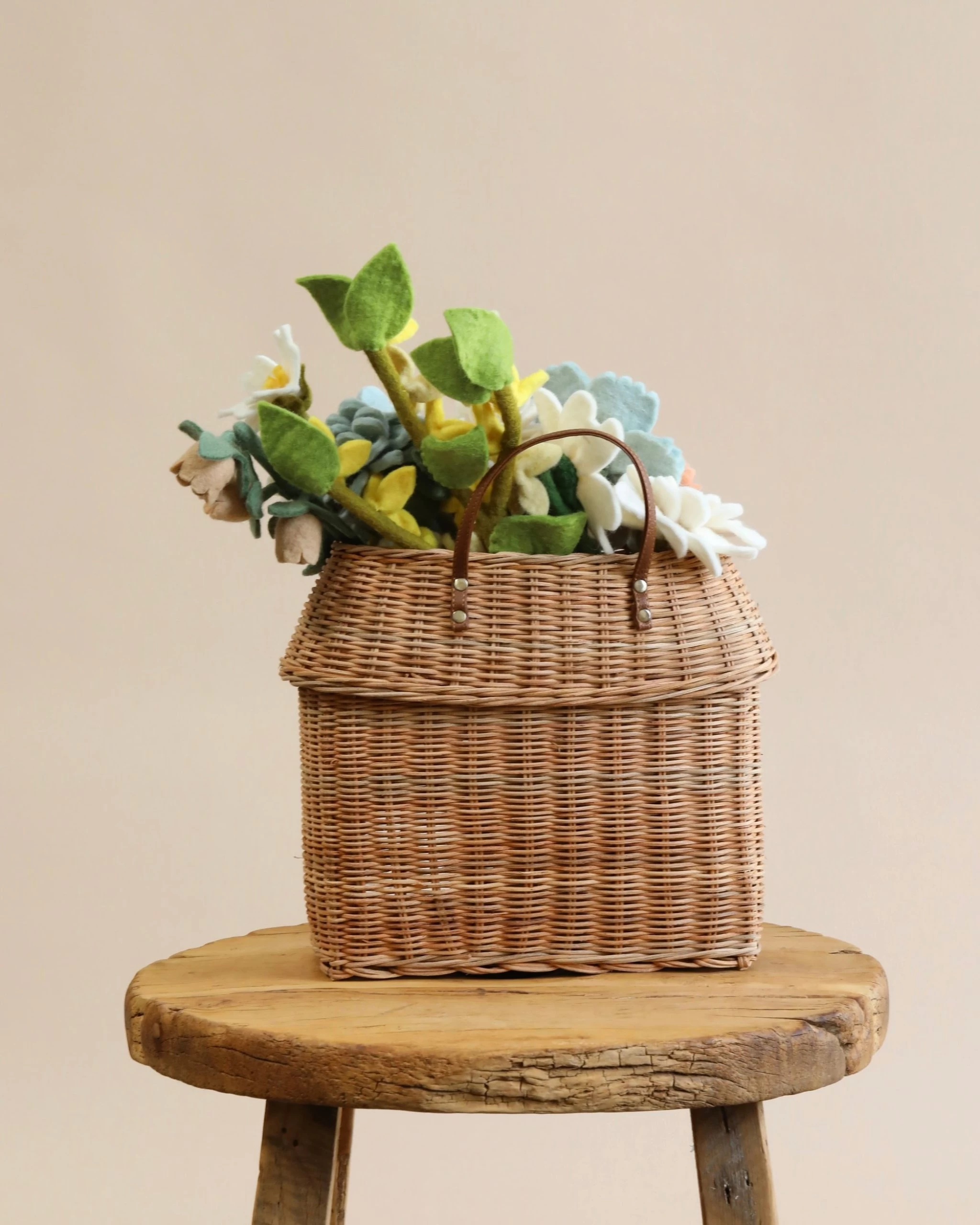 This set includes mixed felt flowers and leaves and a wicker basket that can be hung on a wall or put on a shelf.