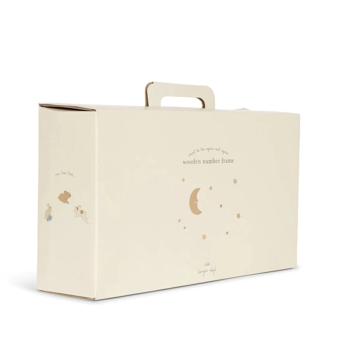 Wooden frame designed with turnable square bricks with numbers on one side and an equivalent number of illustrations on the other.