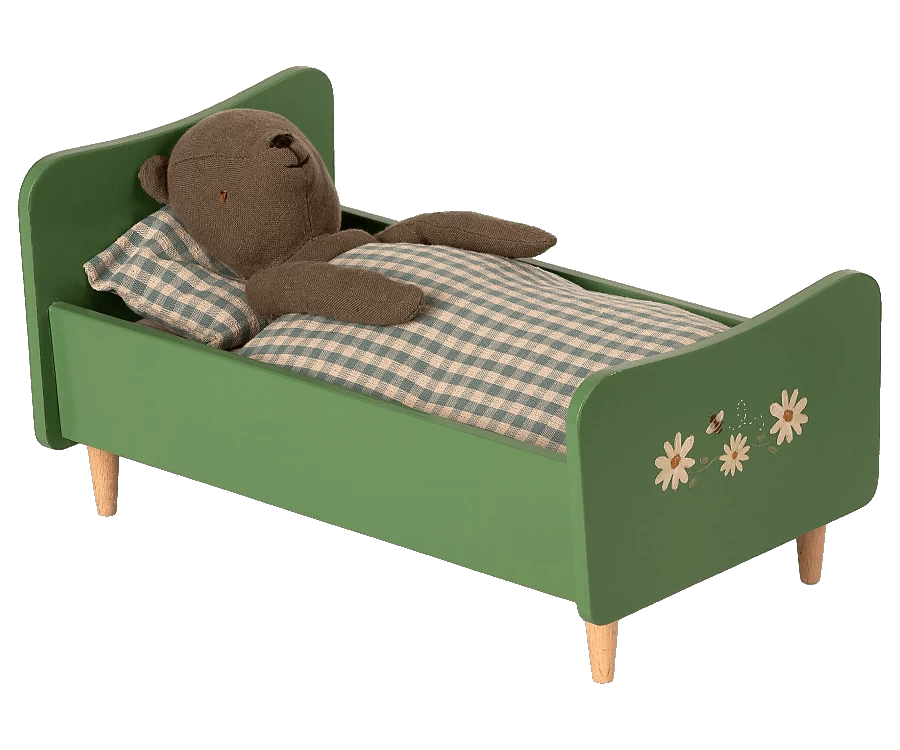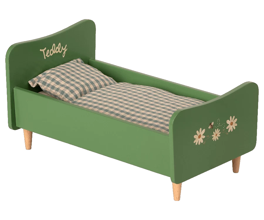 A wooden bed that fits the Teddy dad perfectly. Beautiful handpainted details on the bed – variation may occur. Soft bedlinen, made in unique fabrics, will keep the teddy warm all night.