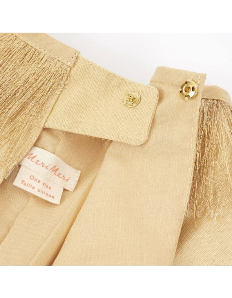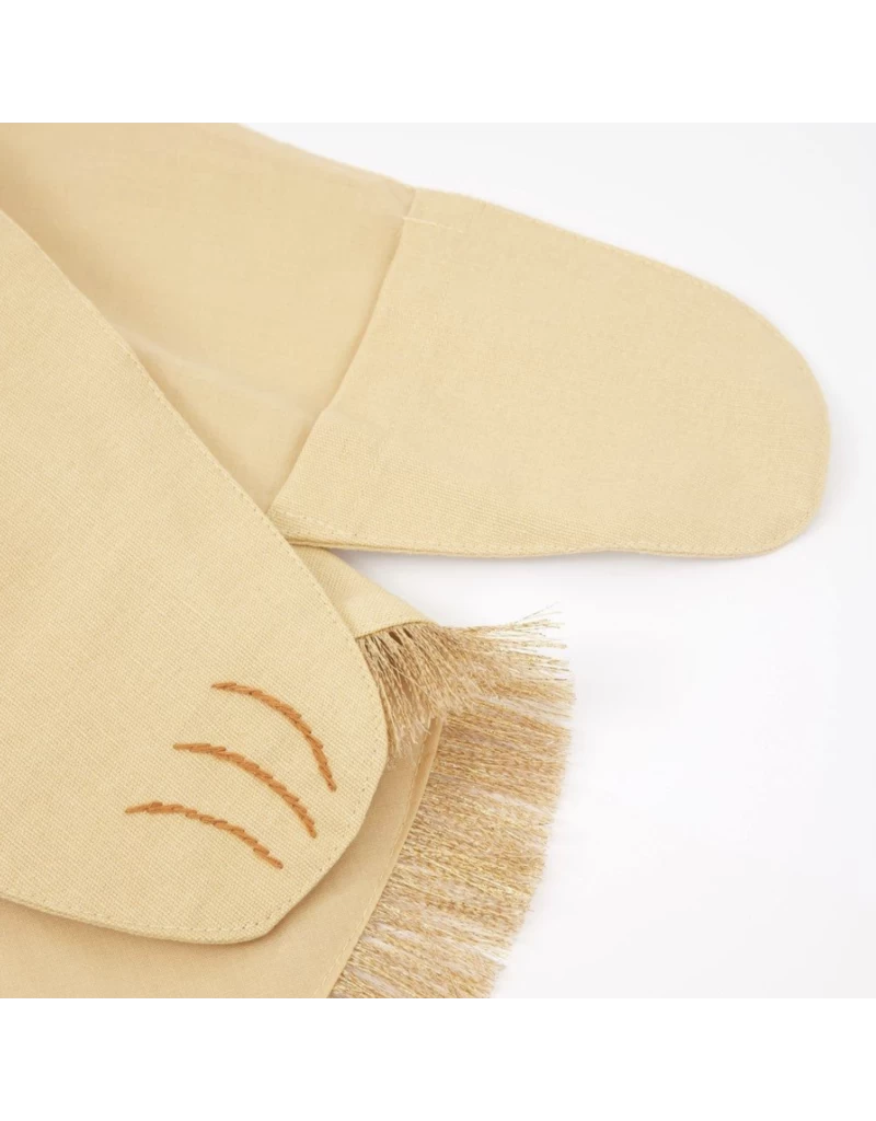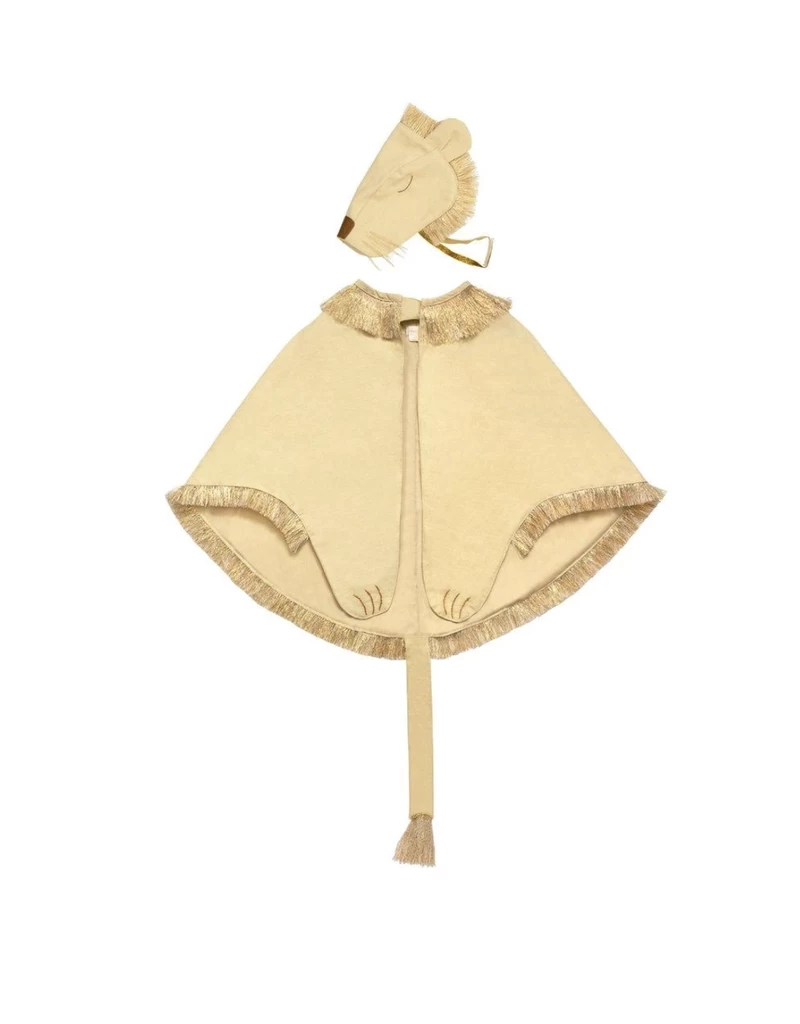- The lined canvas cape features gorgeous gold fringing, paw details and a terrific tasseled tail