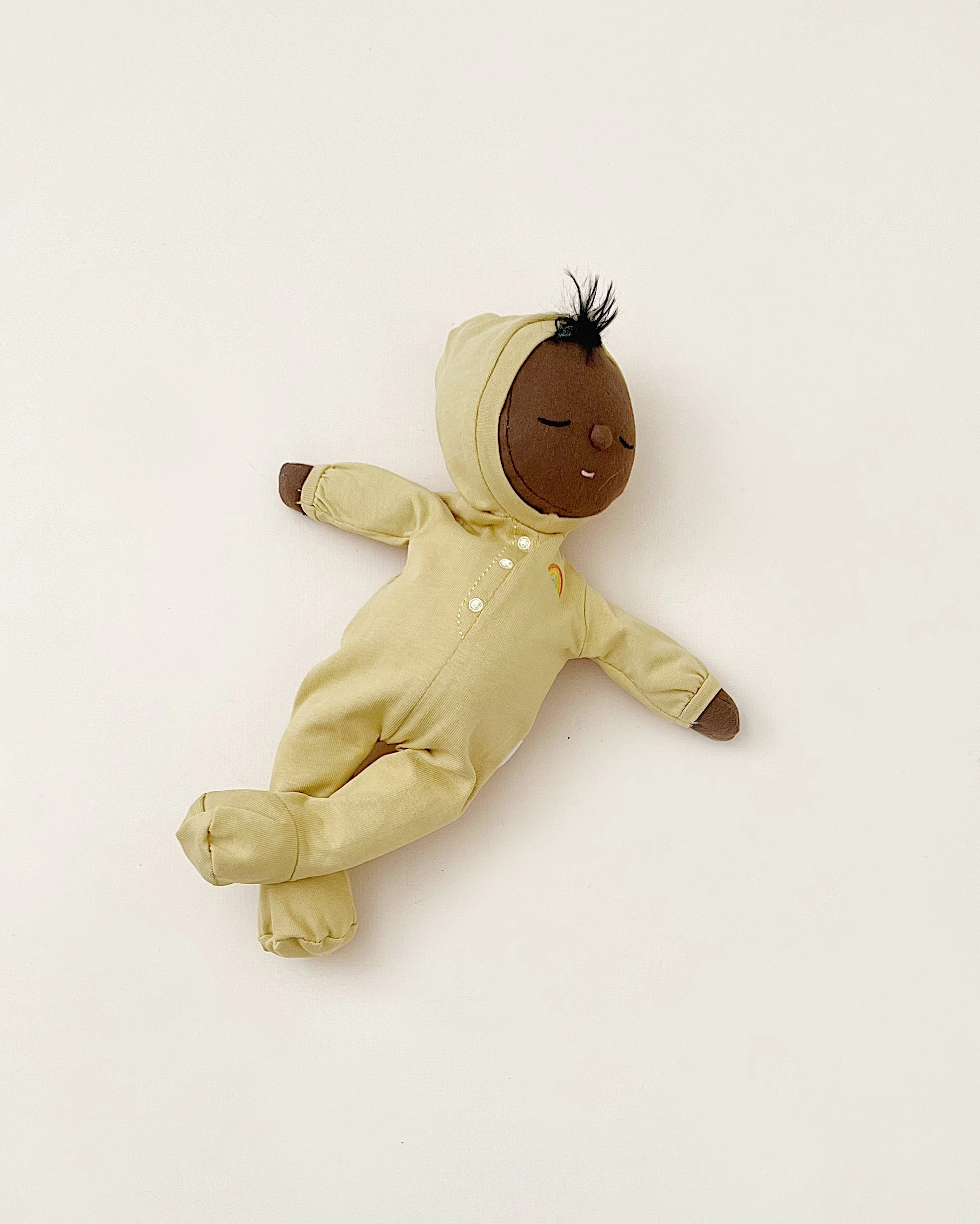 They feature the sweetest embroidered face with a tuft of hair and wear a non-removable onesie with a rainbow over the heart.
