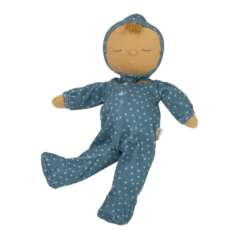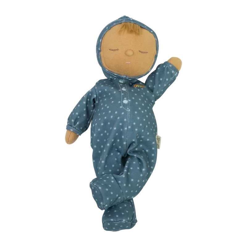 Dozy Bean is posable, made from super soft cotton, and features the sweetest embroidered face with a little tuft of hair. Each Daydream Dozy Dinkum wears a fixed suit with a rainbow right over their heart.