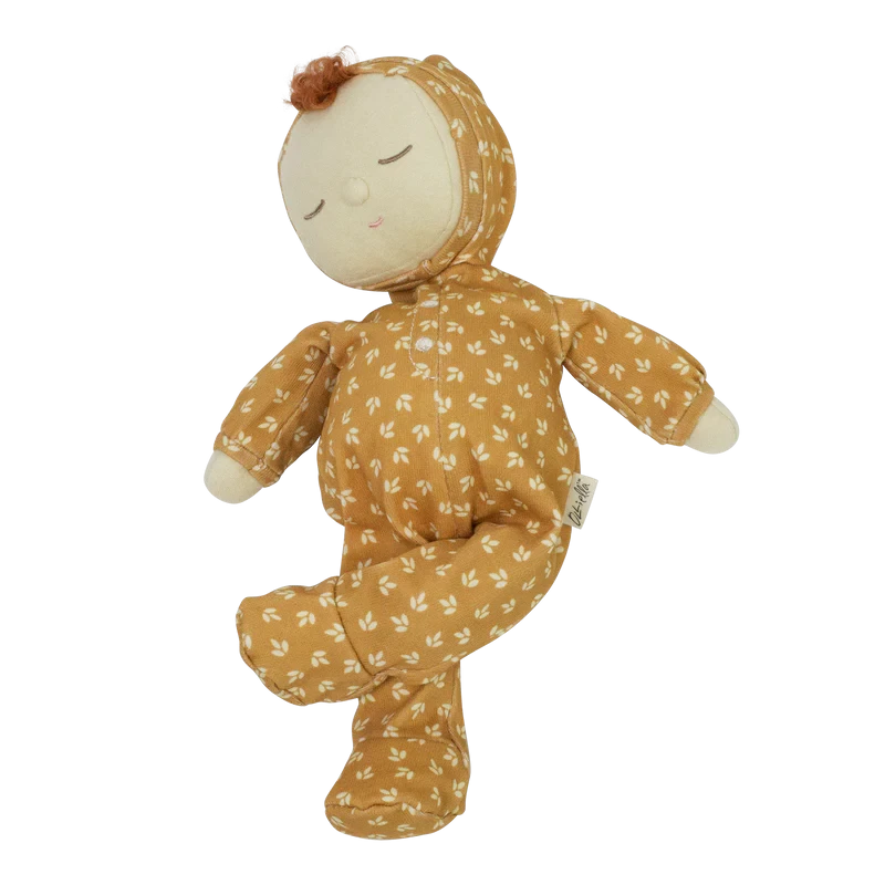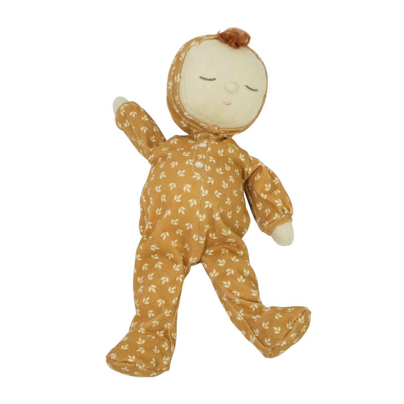 Dozy Bean is posable, made from super soft cotton, and features the sweetest embroidered face with a little tuft of hair. Each Daydream Dozy Dinkum wears a fixed suit with a rainbow right over their heart.