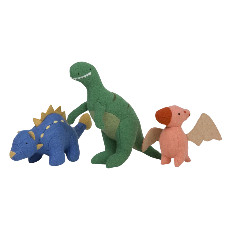 Come and explore the prehistoric world, where you will meet its resident Dinosaurs Pterodactyl, T-Rex and Ankylosaurus. Handmade from a soft wool blend with embroidered features, these three dino friends are the perfect size for small hands and make wonderful prompts for hours of imaginative play.