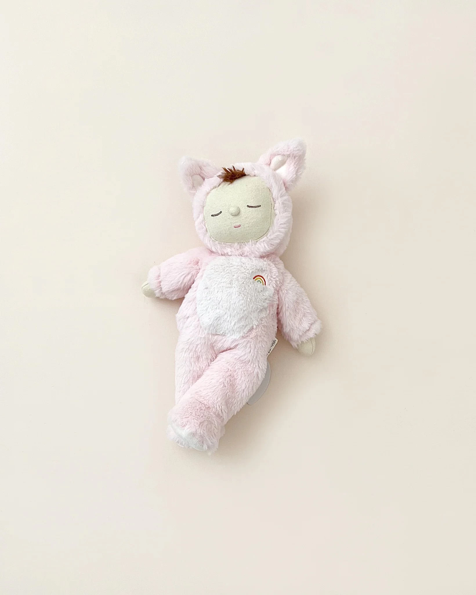 - Cozy Dinkum Dolls wear a non-removable plush onesie with ears and embroidered rainbow over the heart.