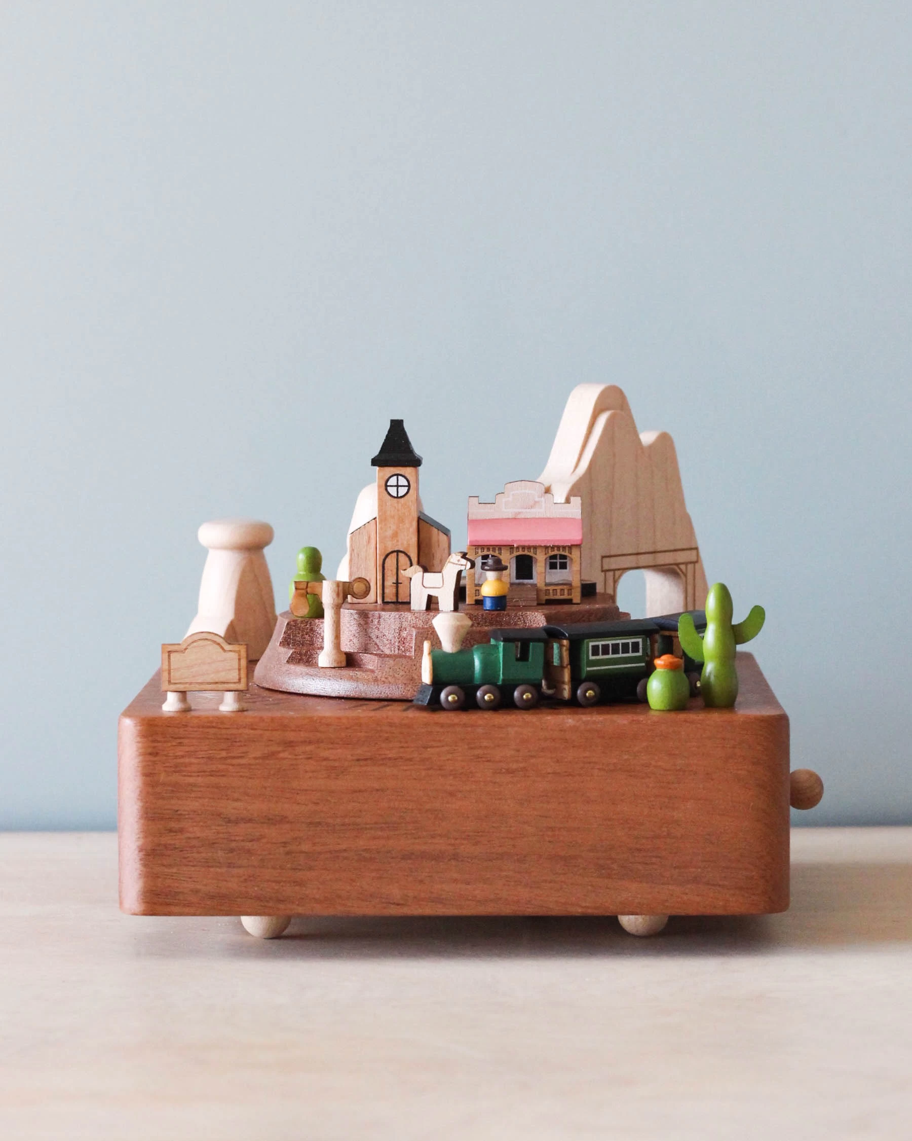 Combining nostalgia and a classic design, this hand cranked music box makes a great addition to any room or as a decoration on a shelf. The on/off toggle allows the music to start and turn off easily, while the clockwork mechanism enables the train to go around while the music is playing.