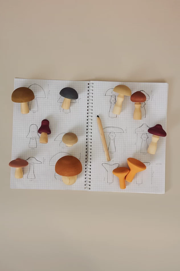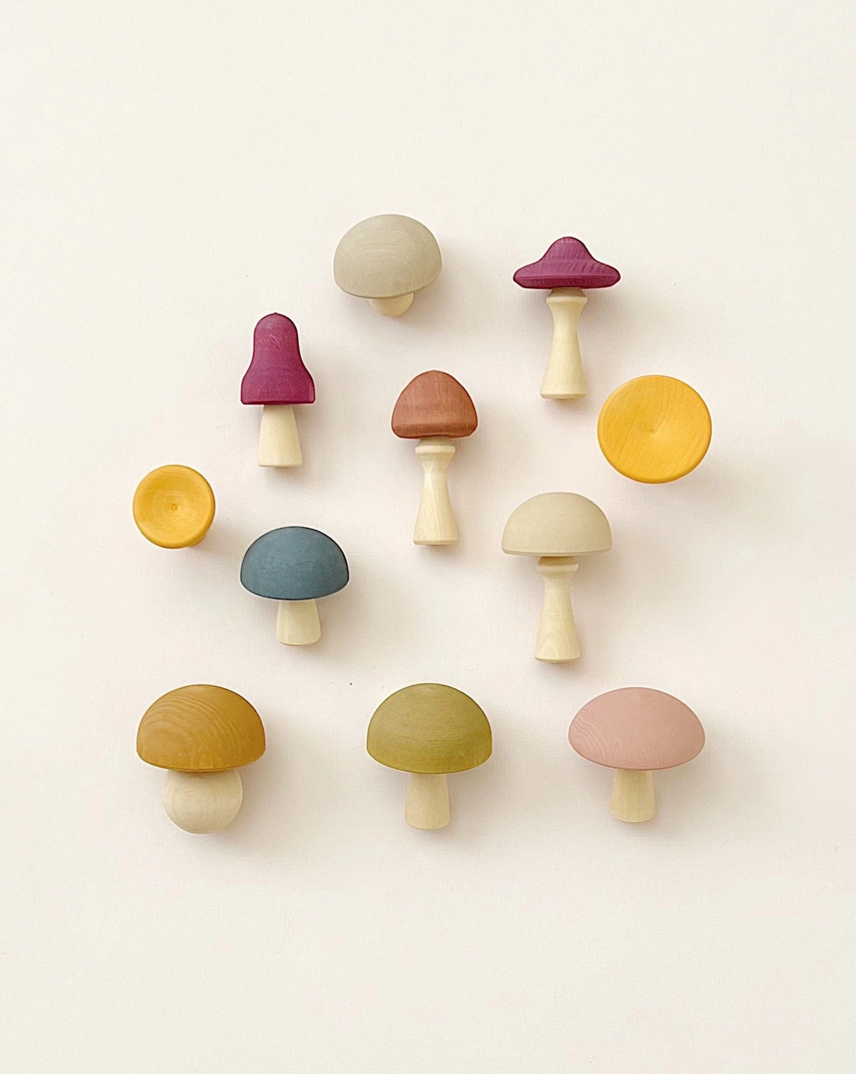 Contains 11 mushrooms, handmade in Russia by Raduga Grez, from lime wood wit non-toxic paint.