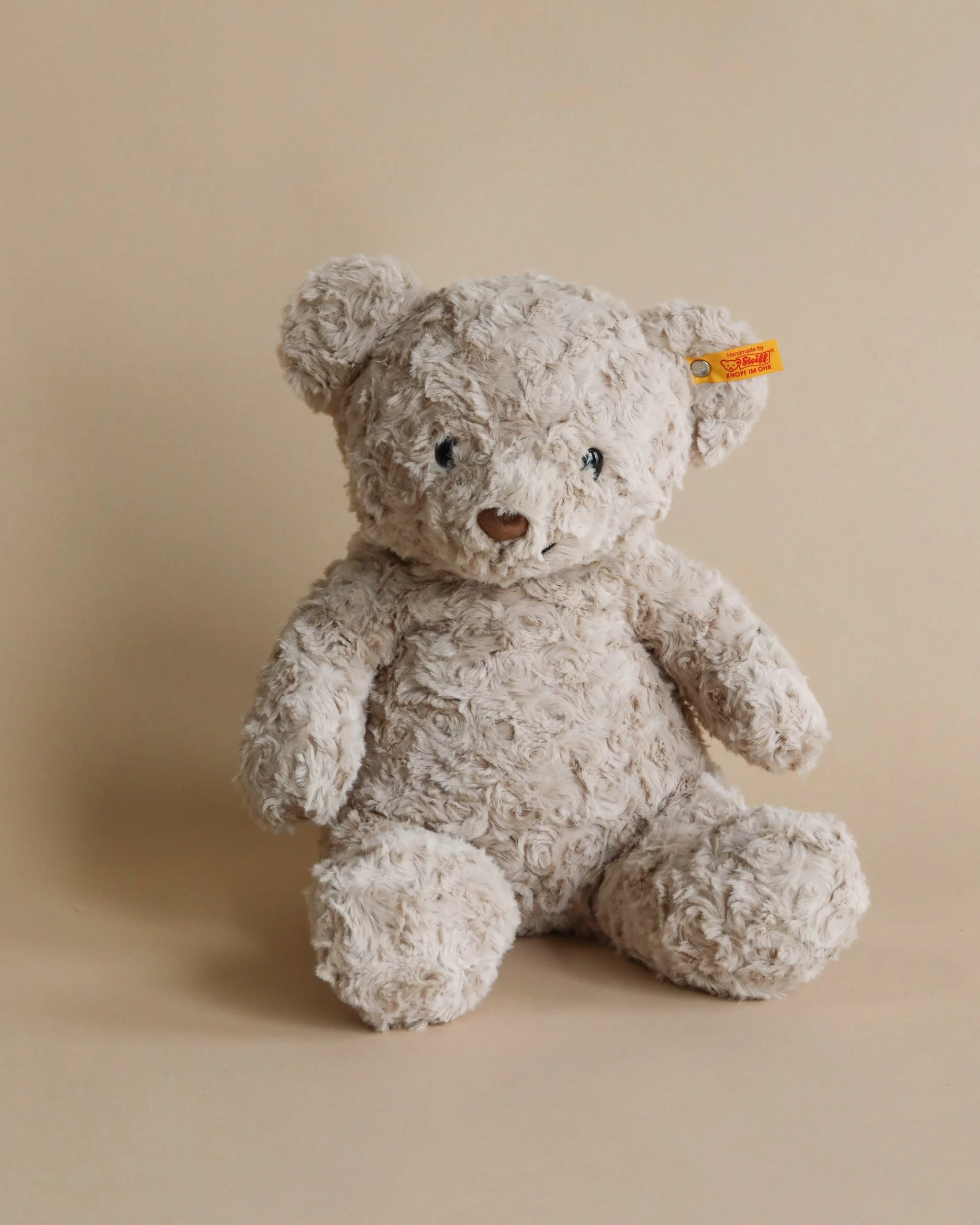 At 15″, this large and cuddly friend has a honey-sweet smile that children adore. A machine washable design makes it easy to clean a kid’s plush best friend for more childhood adventures. Gift this delightful Honey Teddy bear for birthdays, holidays and special occasions and know that he will become a treasured all-day playmate or high-quality companion for older children. Bean bags included at his rear, paws and soles let him sit on a shelf, on top of a toy chest or at a kid’s table. For toddlers and babies, these bean bags in Honey are also perfect for teaching your child to grip. Every Honey bear plush is individually handmade by our skilled artisans and rigorously safety-tested because as our founder said, “Only the best is good enough for children.” This sentiment is represented by our trademark “Button in Ear” on Steiff plush toys. Our Steiff Honey Teddy Bear comes in four other sizes: miniature (6″), small (7″), medium (11″), and extra-large (19″).