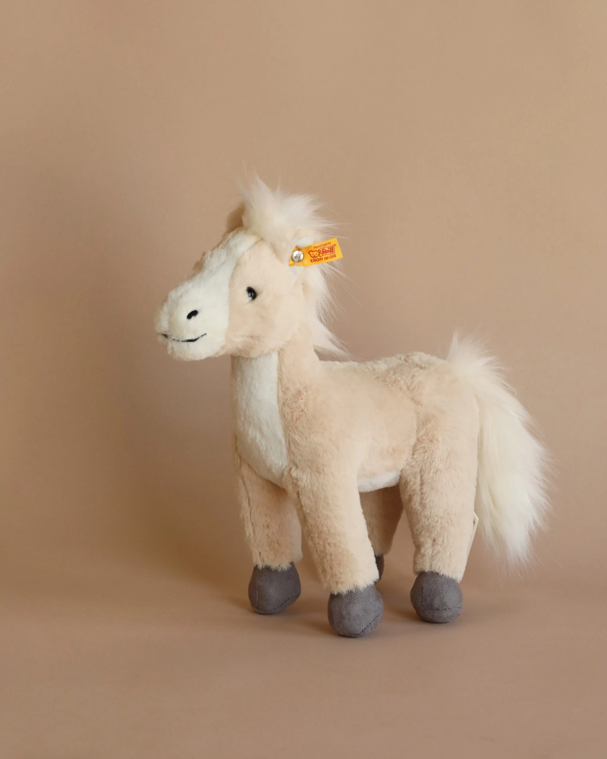 This Soft Cuddly Friends Gola horse is absolutely adorably and incredibly irresistible! With her silky beige and white plush, fuzzy mane and tail, and her sweet face, Gola spreads happiness everywhere she roams. This lovable little horse invites you to snuggle up and dream with her – of flowering meadows and wild rides into the world of imagination! It’s lovingly handmade from premium-grade materials by Steiff’s skilled artisans. Gola proudly wears the world famous “Button in Ear” trademark, symbol of highest quality. From the company that invented the Teddy bear in 1902.