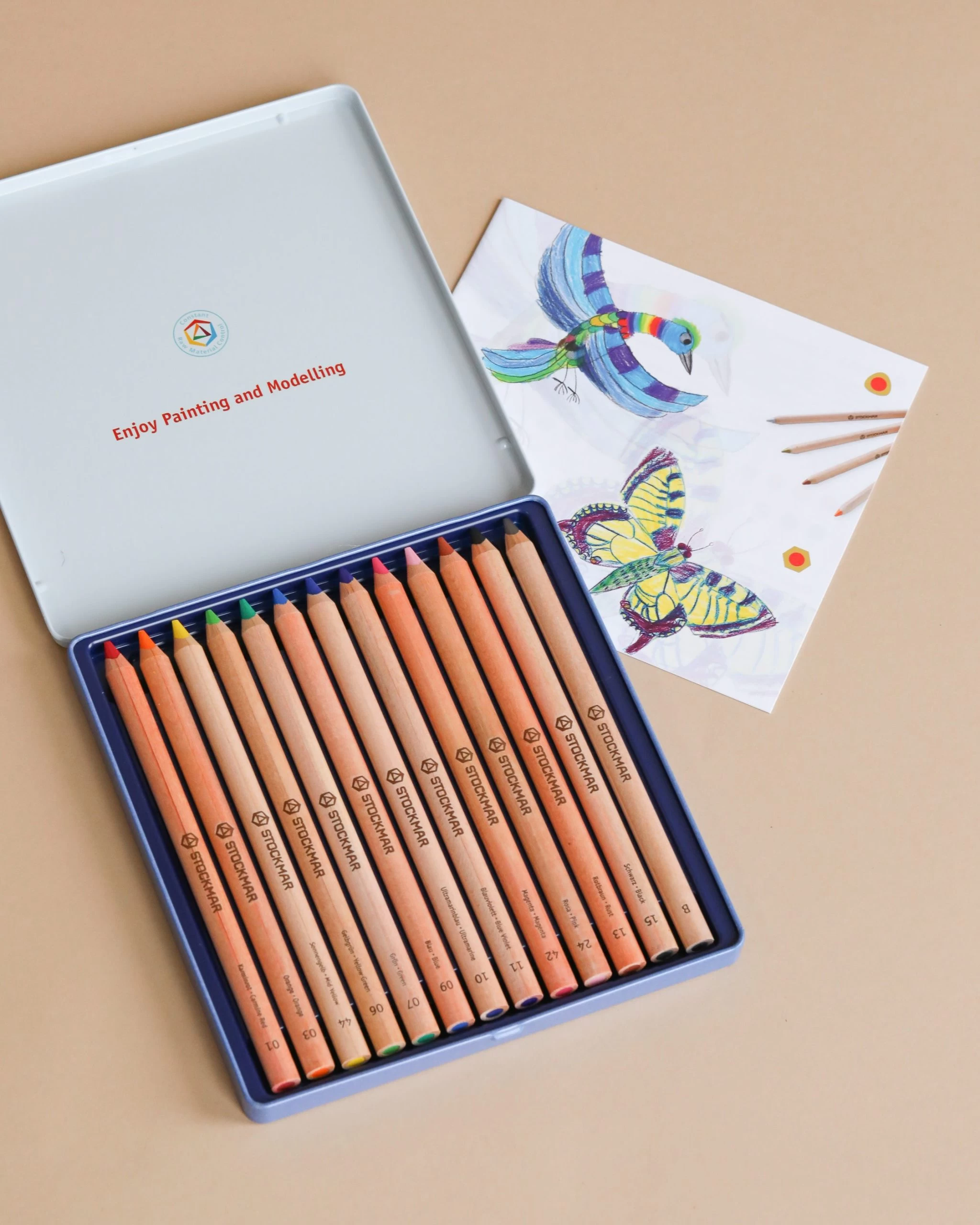 Stockmar brings 80 years of experience in creating high-quality German art products to this line of colored pencils for artists young and old. These natural, unlacquered pencils feature a large triangular shape. This 13 pencil set comes in an expanded range of Stockmar’s luminous colors. Stockmar colored Pencils are distinguished by their exceptionally vibrant colors, high proportion of pigment, unique color coordination system and a soft yet powerful application of color. The extra thick lead cores are extremely break resistant, water resistant, wear longer than standard colored pencils and require less frequent sharpening. And because every picture starts with a sketch, the set also includes a graphite B pencil which can be erased particularly well. The pencil wood is from sustainably managed forests, and the pencils come with FSC certification. color: 01 carmine red | 03 orange | 06 yellow green | 07 green | 09 blue | 10 ultramarine | 11 blue violet | 13 rust | 15 black | 24 pink | 42 magenta | 44 mid yellow + graphite B