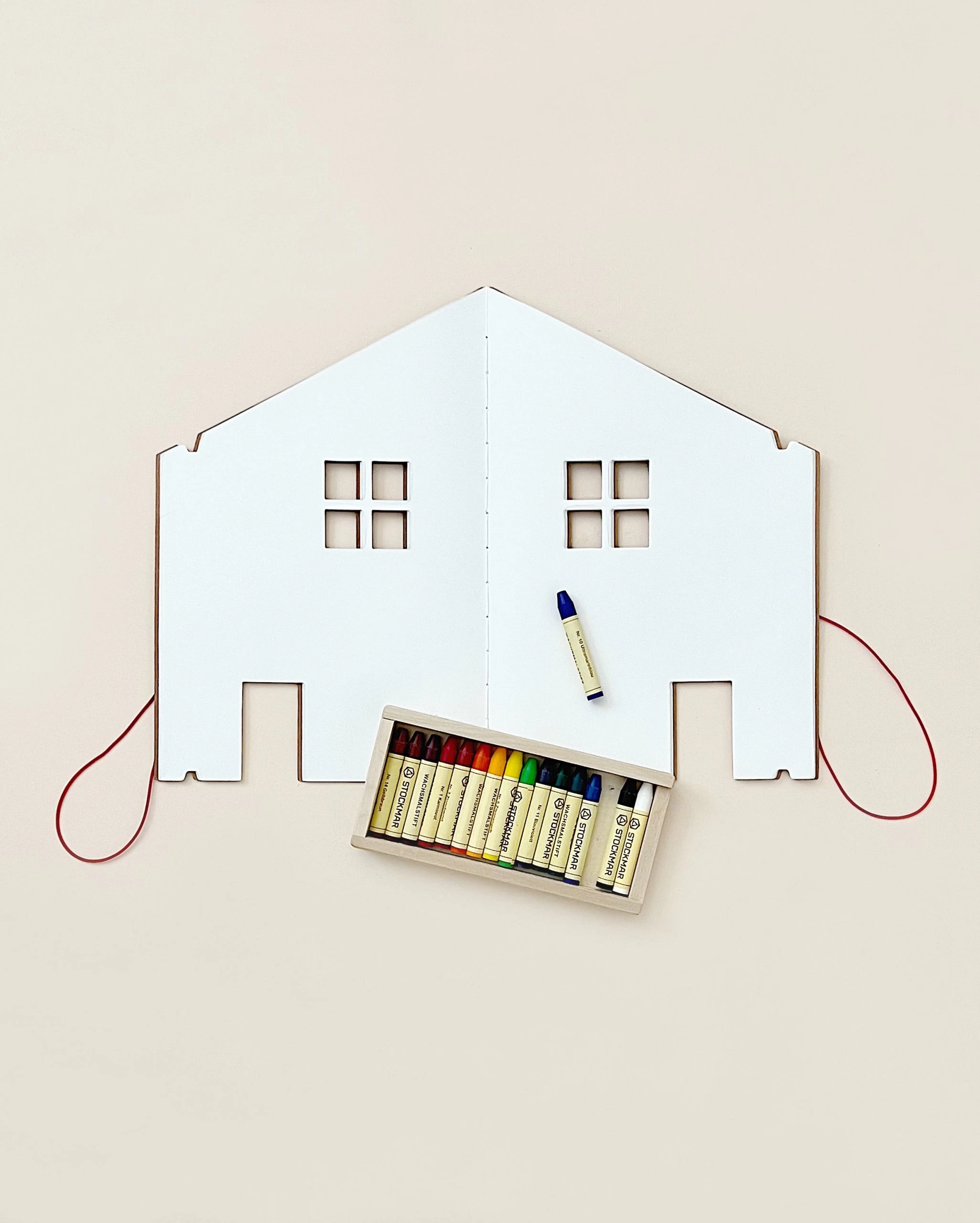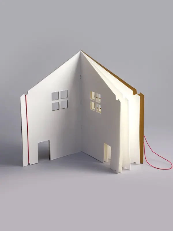 Silkscreen printed cardboard cover, hand-stitched and comes with elastic cords to hold the pages when the bear’s sitting.