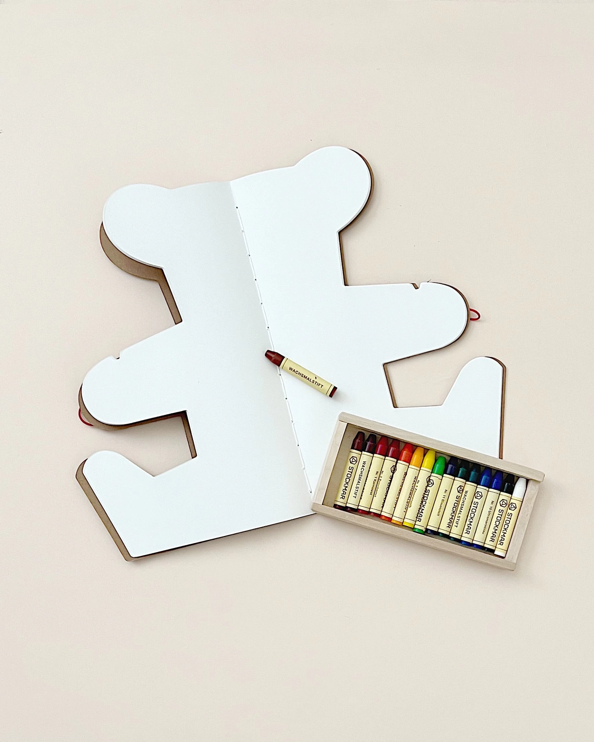 Silkscreen printed cardboard cover, hand-stitched and comes with elastic cords to hold the pages when the bear’s sitting.