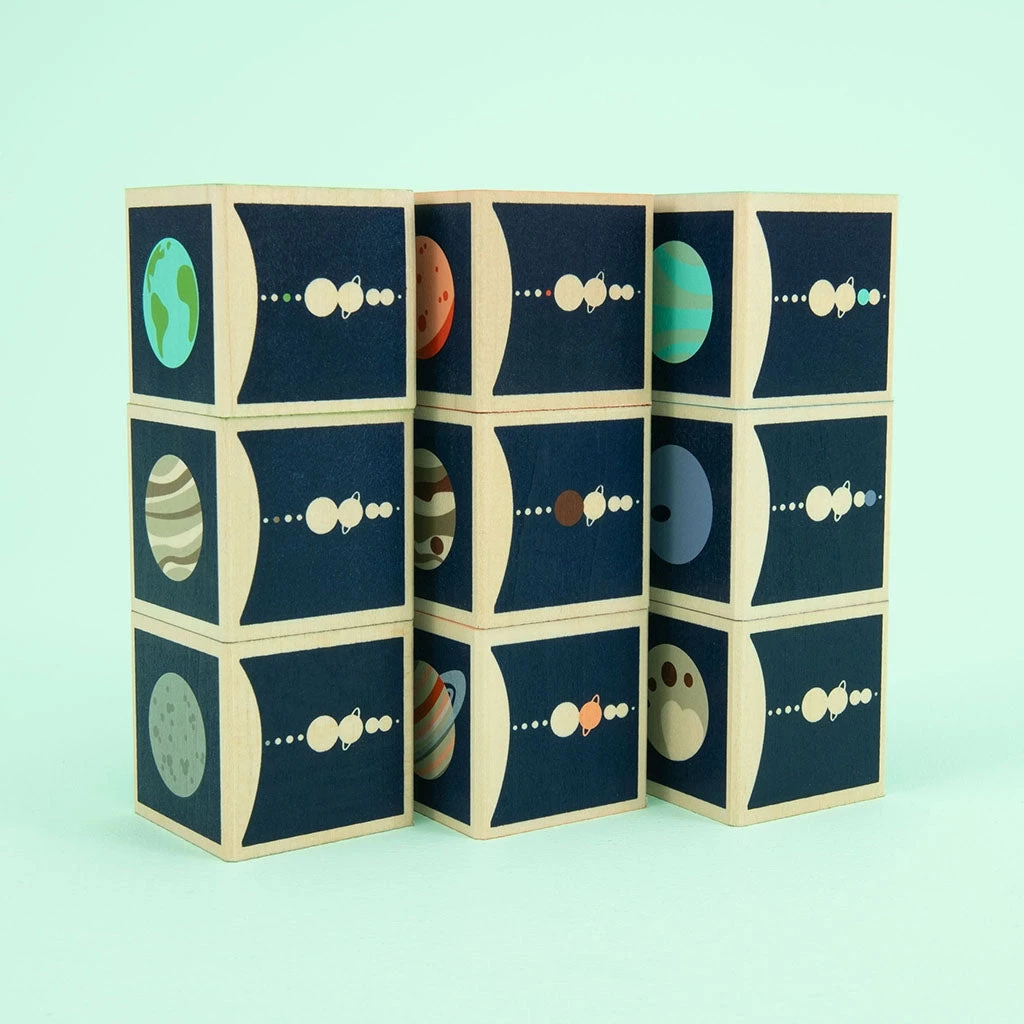 Mercury. Venus. Earth. Mars. Jupiter. Saturn. Uranus. Two debossed sides feature the planet’s symbol, name, and number of moons. The four printed sides reveal a planet illustration, diameter, location, and distance from the sun. This 9 block set honors all 8 planets in our solar system; plus a bonus dwarf planet, Pluto.