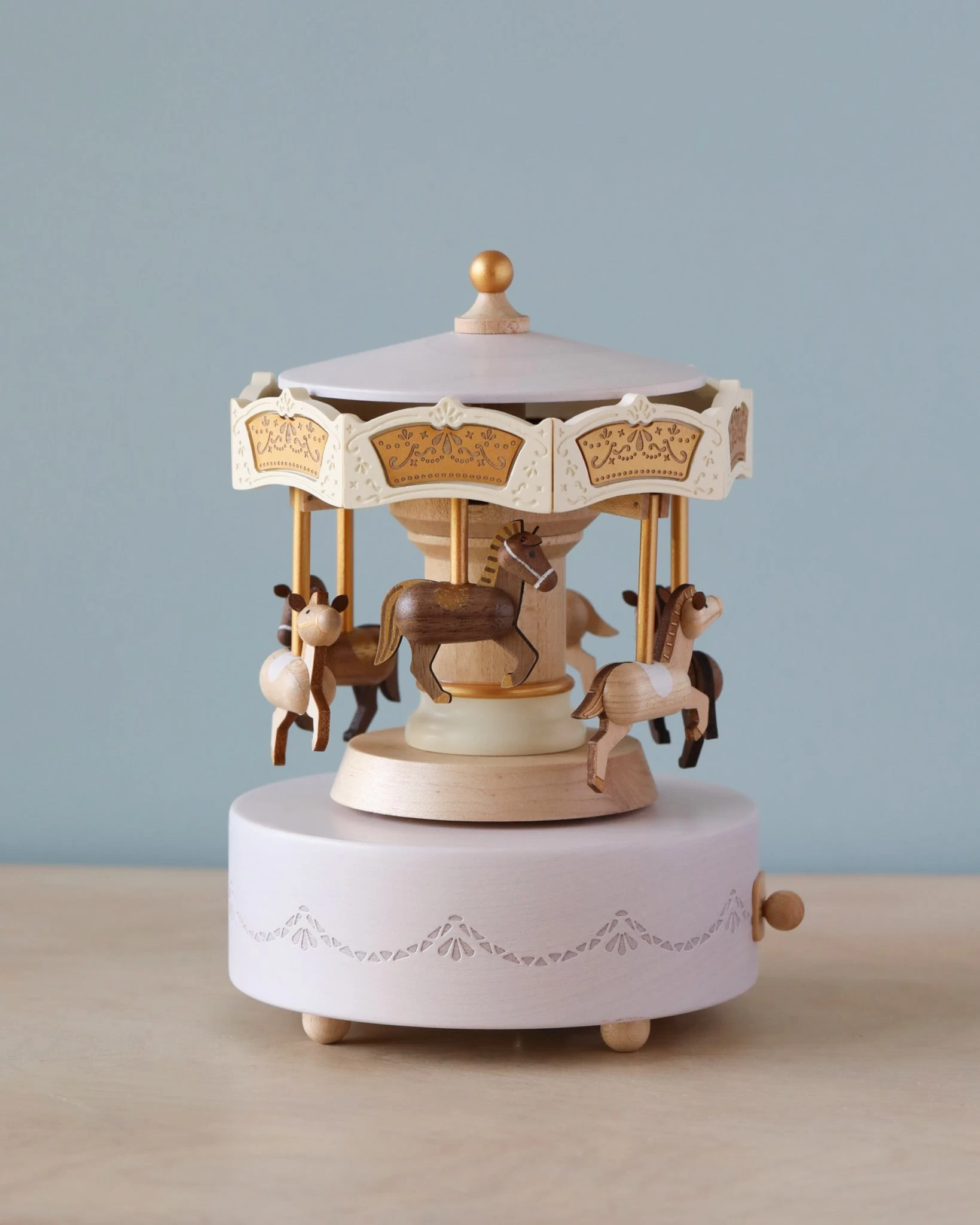 Combining nostalgia and a classic design, this hand cranked music box makes a great addition to any any room as a decoration on a shelf. The on/off toggle allows the music to start and turn off easily, while the winding mechanism rotates the music box around.