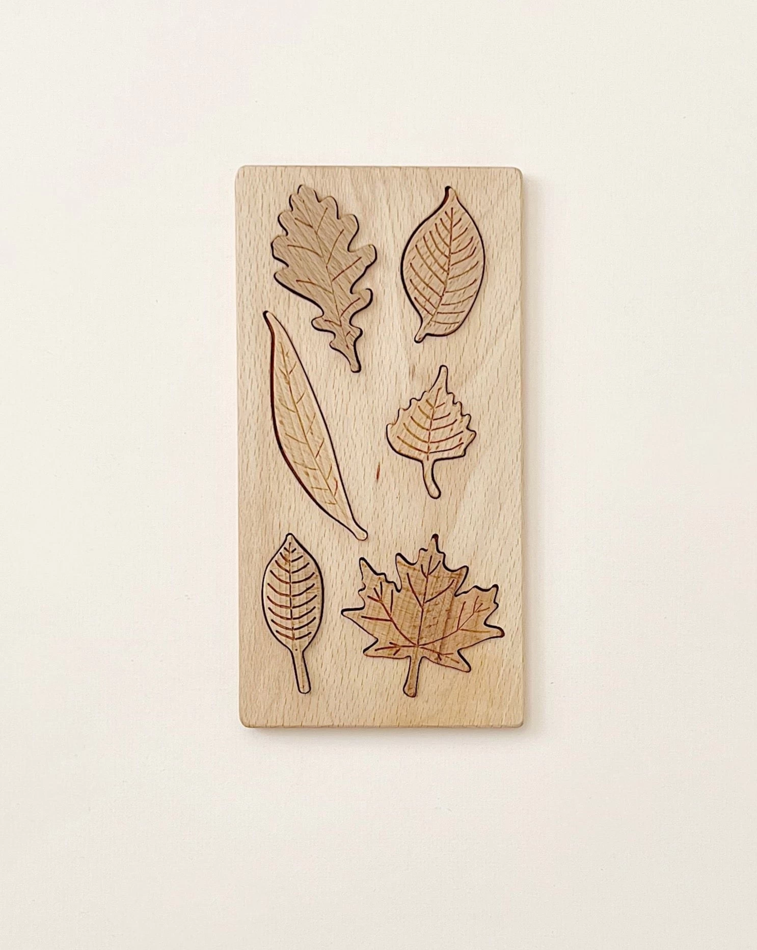 Made of solid beech wood, this puzzle features 6 leaves: oak, elm, willow, maple, birch and cherry.