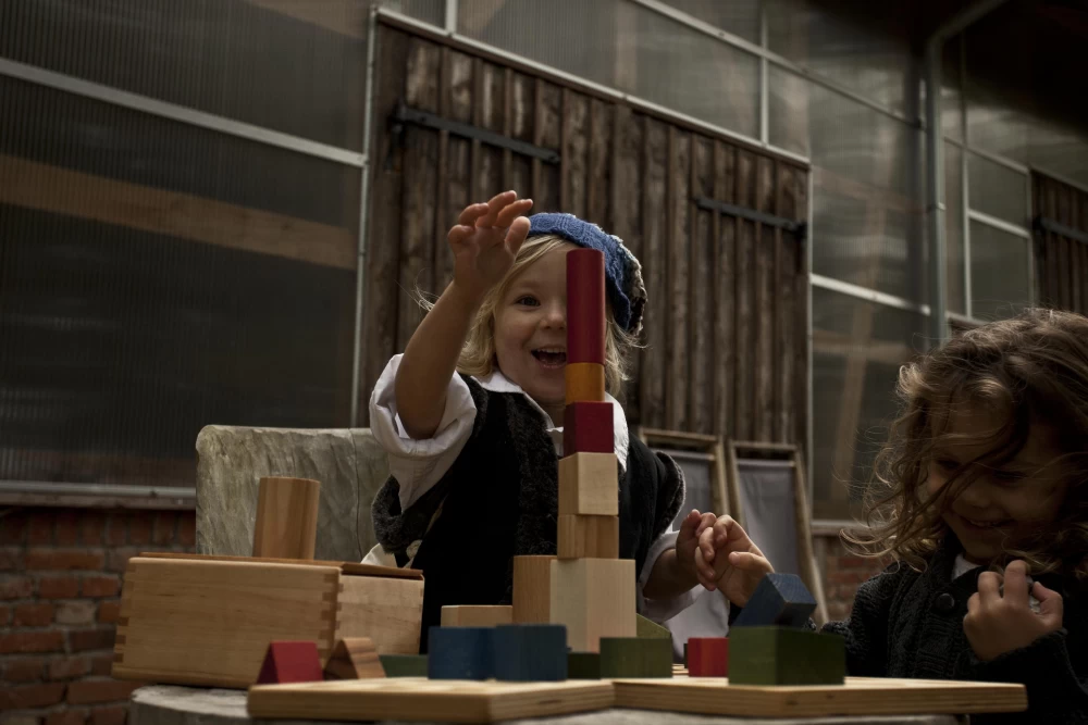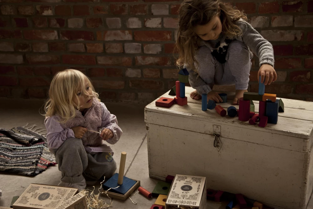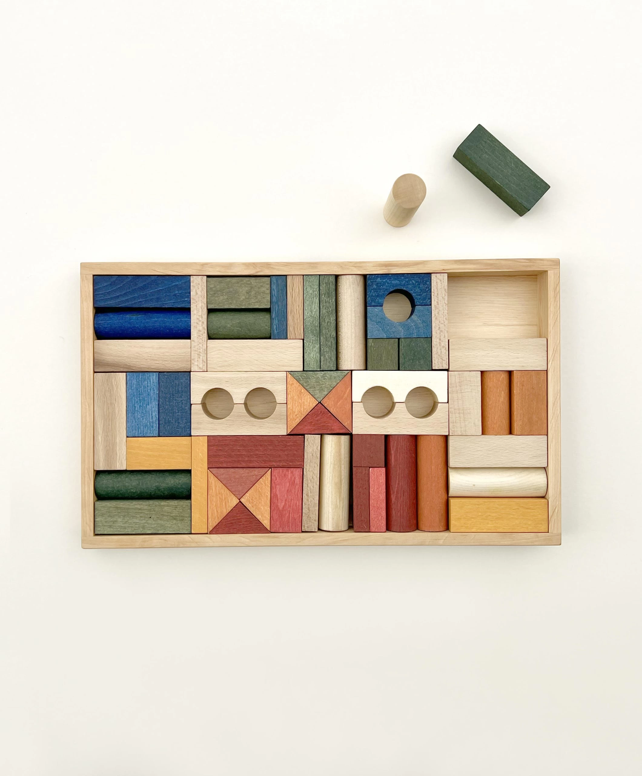 This rainbow block set includes 54 pieces in a box. Each piece is made of solid wood that comes from FSC® certified suppliers. Painted with all natural, eco-certified paints and finished with beeswax and botanical oils.