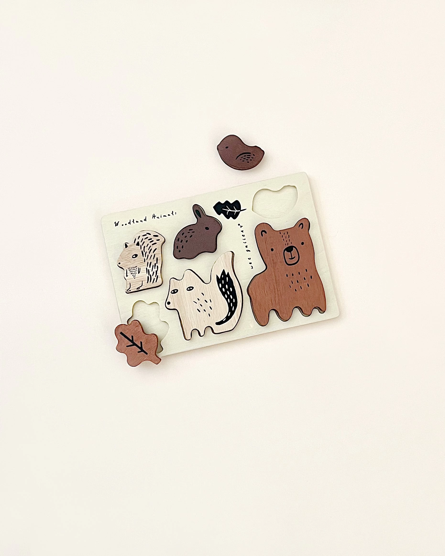 This beautiful six piece Wooden Puzzle is perfect for so many kinds of play! Solving the tray puzzle is just the beginning. You can also use the adorable wooden animals as play time characters in this themed Woodland set. For more educational fun, teach your child to recognize and find each creature in the artwork on the back of each puzzle tray.