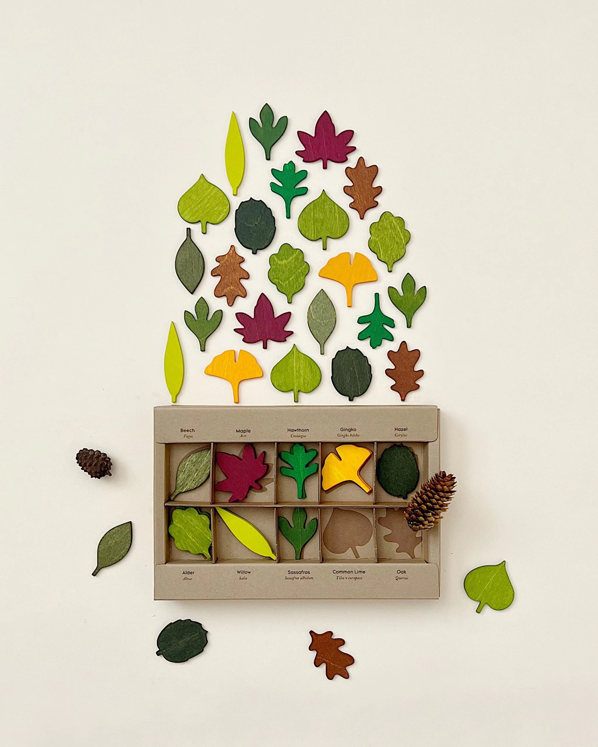 Learn to identify the leaves with different shapes and colors, count, match, make patterns, play games and create a scene for your story. There are endless play ideas with these wooden leaves for loose parts play.